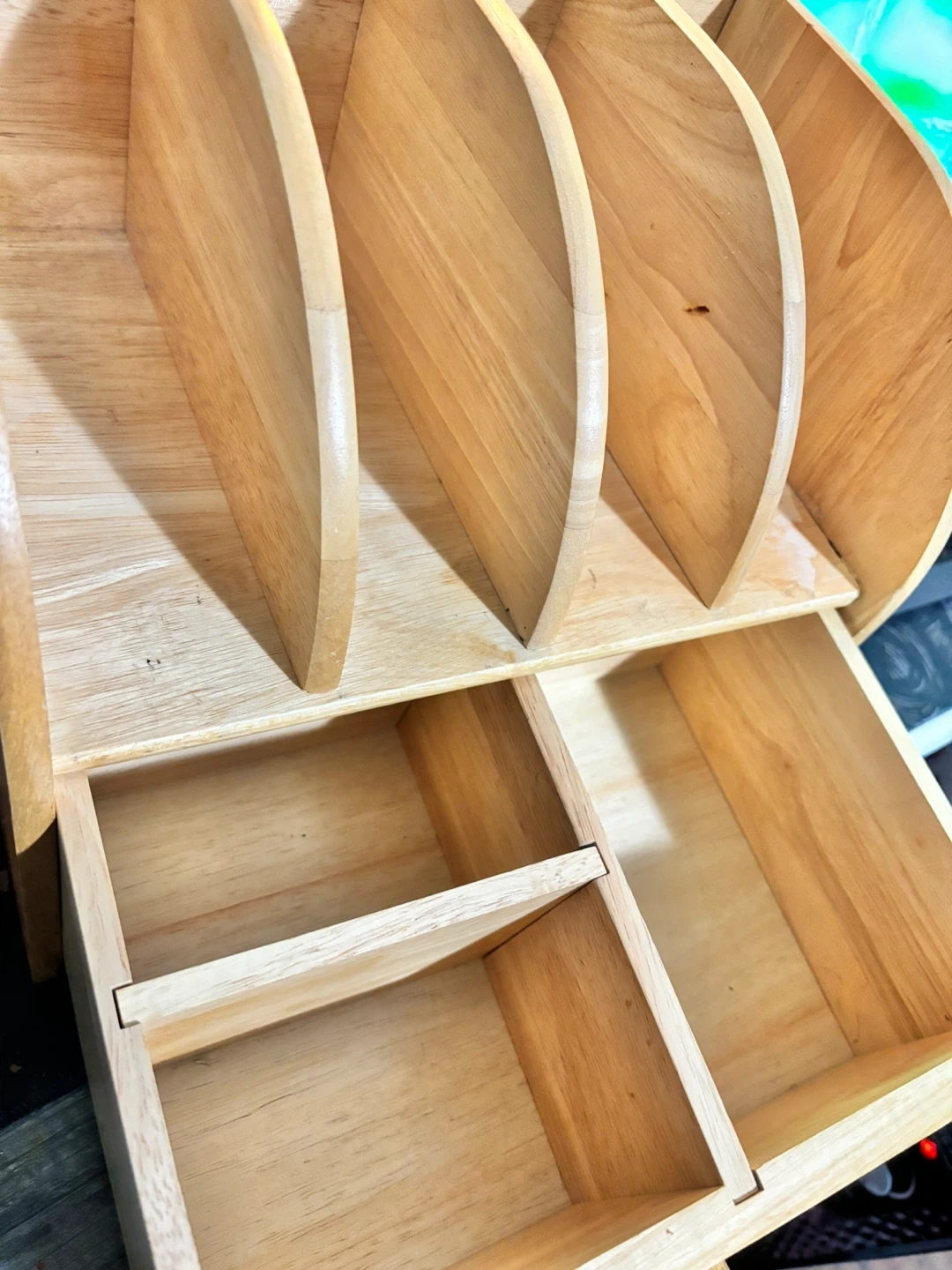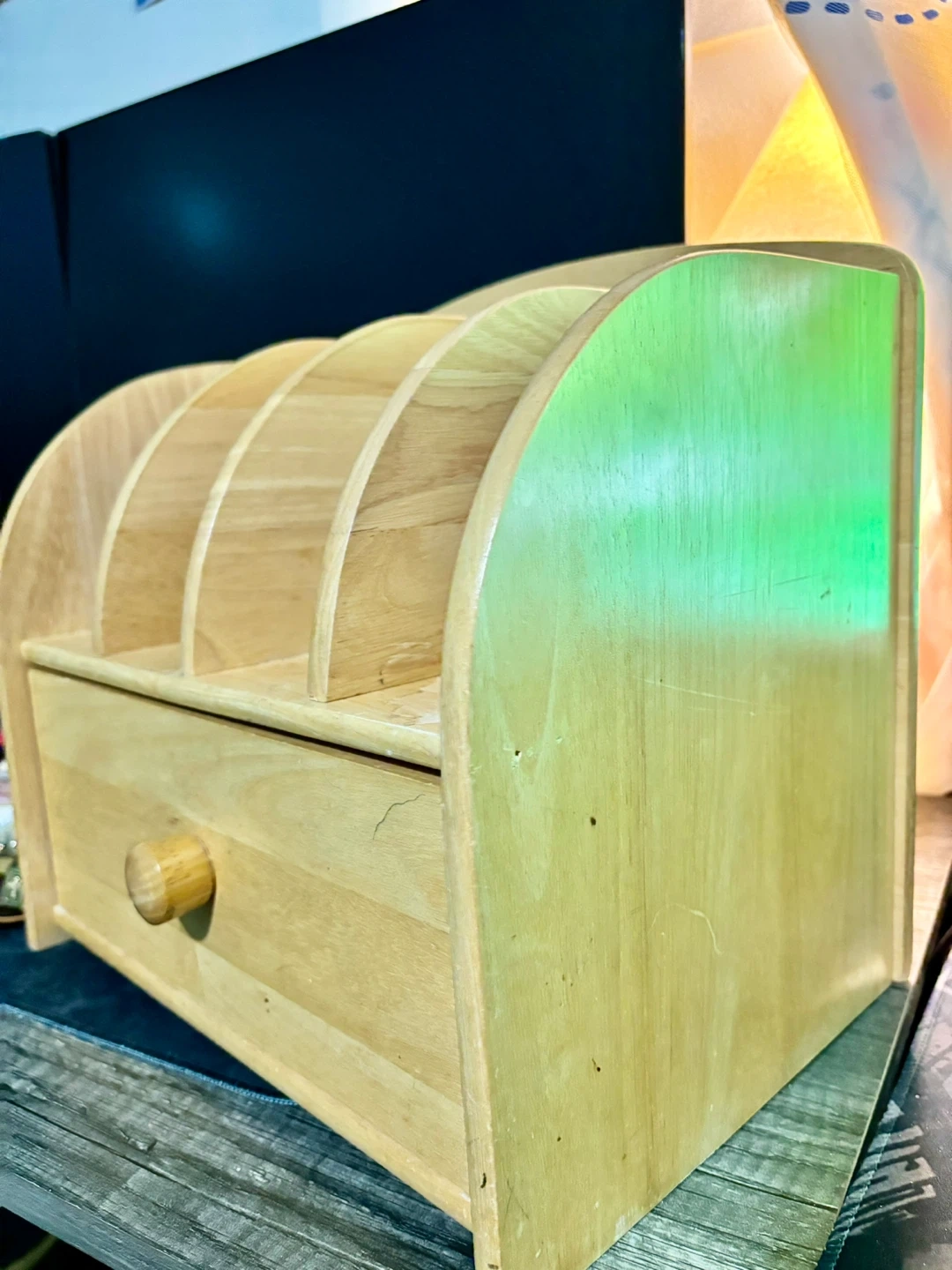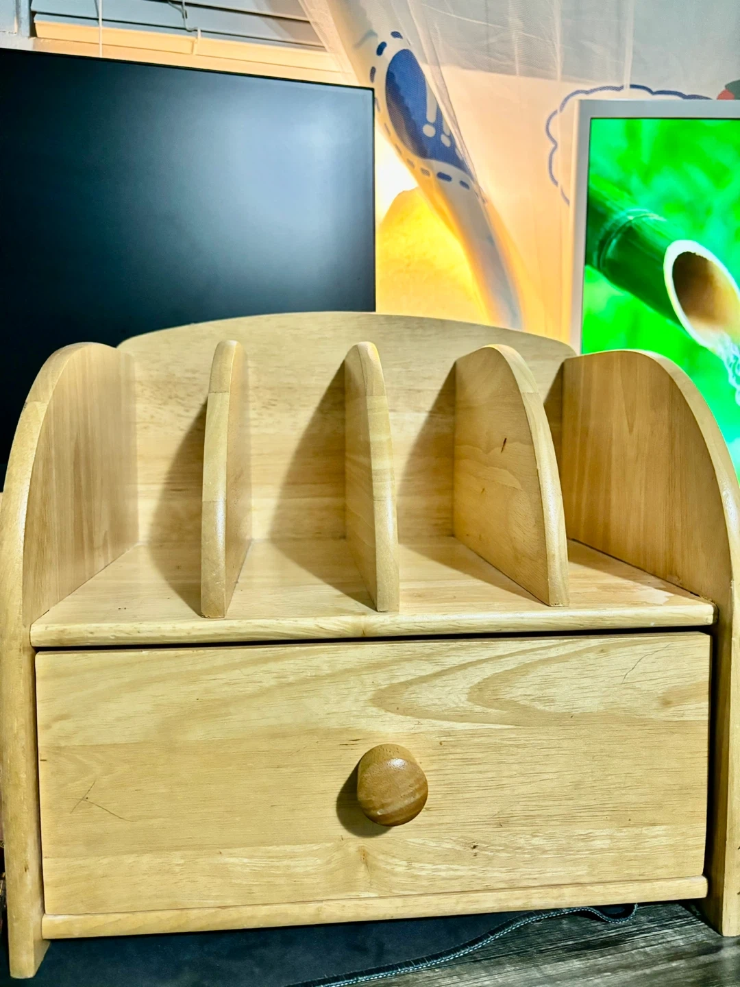 Description: Here's a solid handy wooden desk organizer, perfect for keeping your workspace tidy! It features multiple slots for files and books, plus a convenient drawer for smaller items. Clean, no major damage, and ready to use. Great for home or office use
