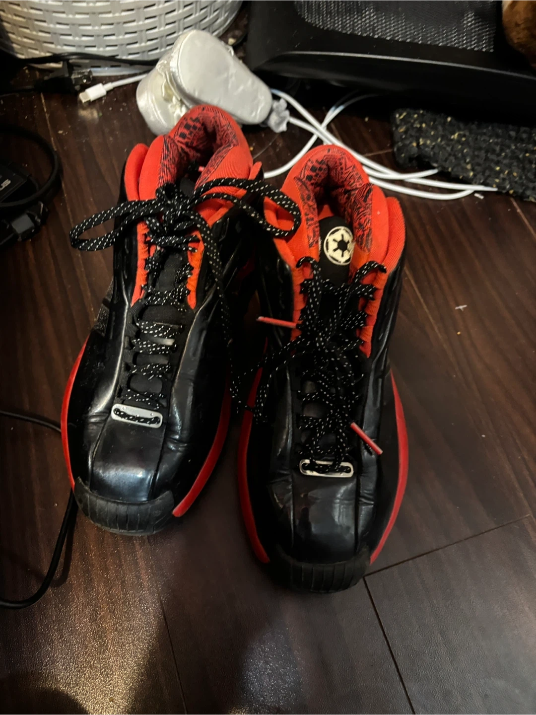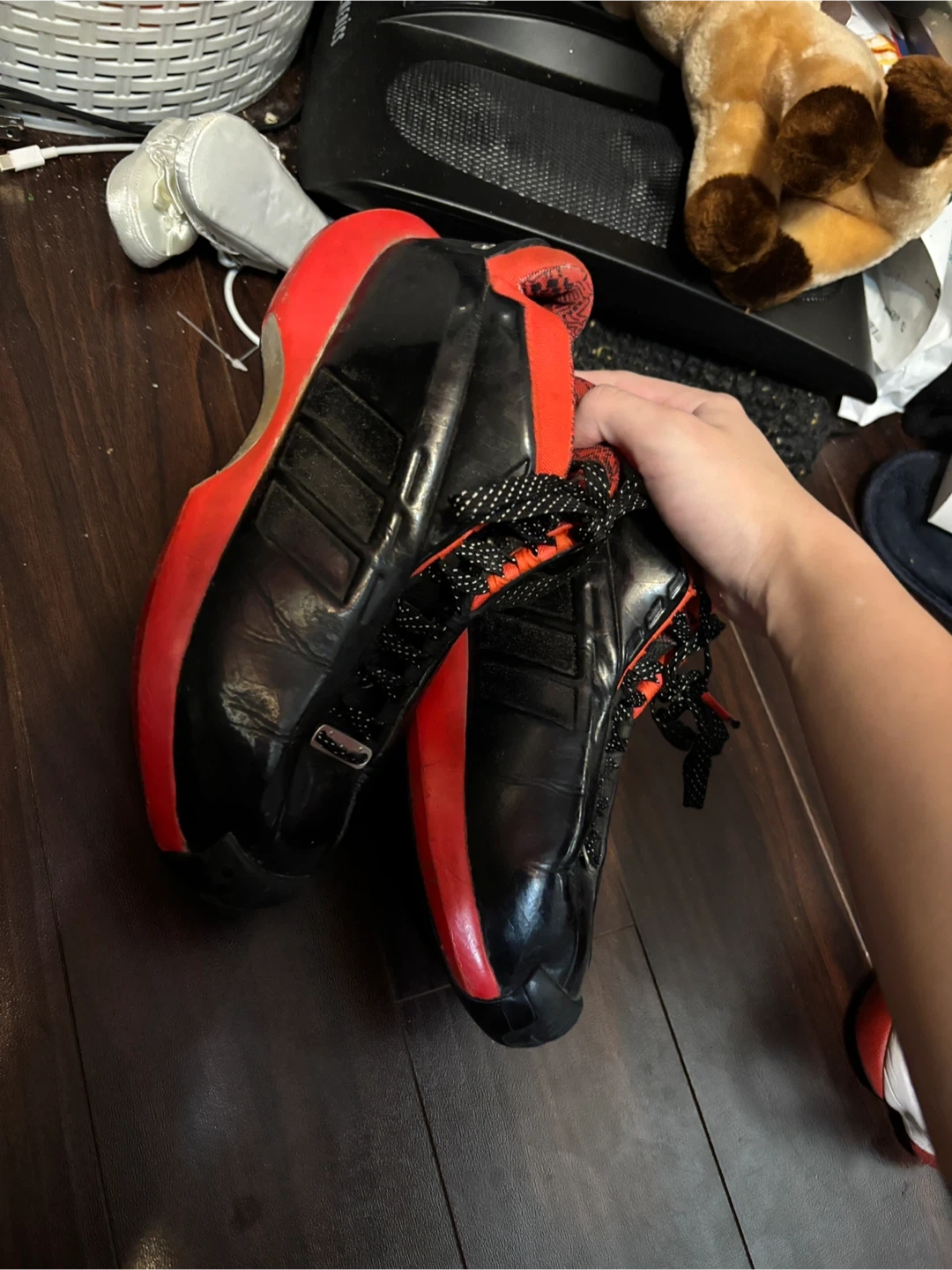 Selling a pair of Adidas T-Mac 5 shoes in black and red. They show some signs of use, but still have plenty of life left! I wore them about 9 times and they are size 8! If you wish to buy them I will clean them first :)