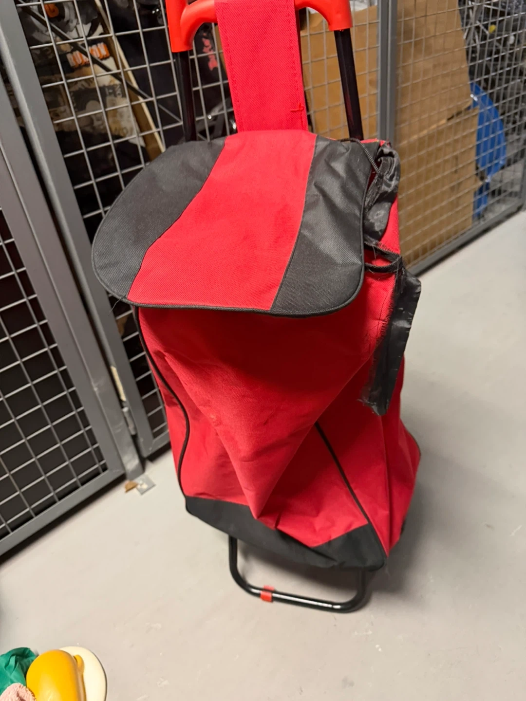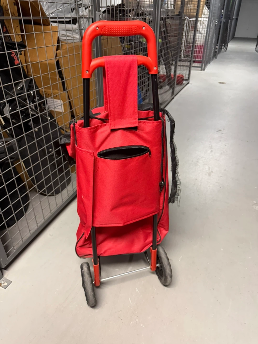 Selling a red and black wheeled shopping cart. It's in good condition and ready to help with your grocery runs or trips to the market. The wheels make it easy to maneuver, and the bag is spacious enough for a good amount of items