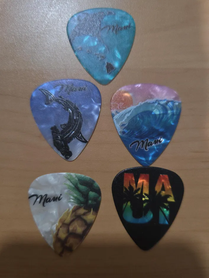 Selling a set of 5 Maui guitar picks! Each pick has a unique design featuring island themes like waves, pineapples, and sea life. Great for any guitar player looking to add some island vibes to their music