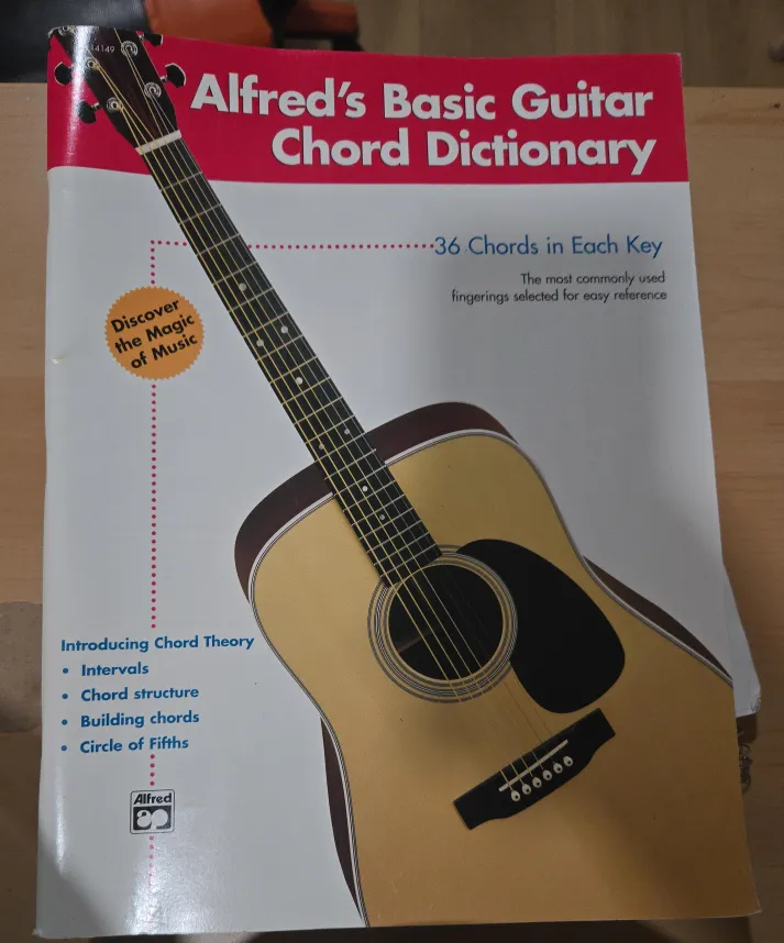 Selling Alfred's Basic Guitar Chord Dictionary. It includes 36 chords in each key, with commonly used fingerings selected for easy reference. It also introduces chord theory, including intervals, chord structure, building chords, and the circle of fifths