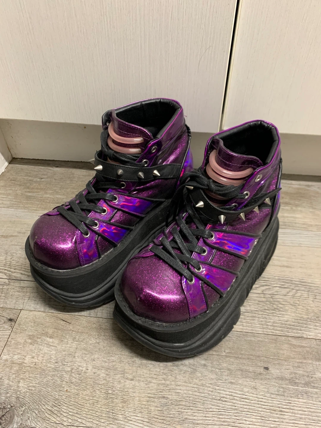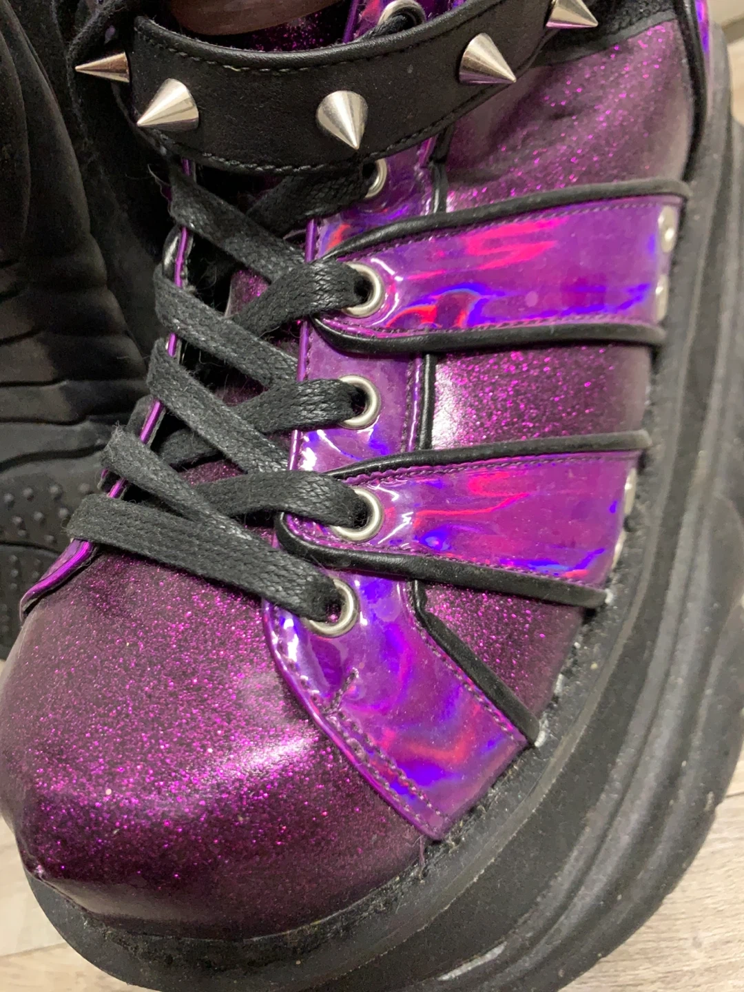 Glittery purple with black laces and studded detailing.
