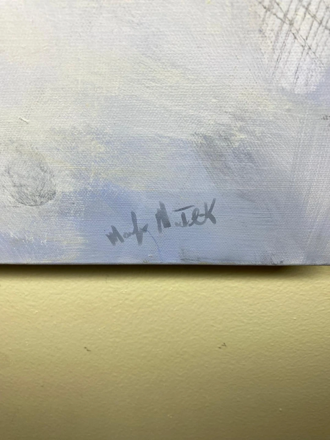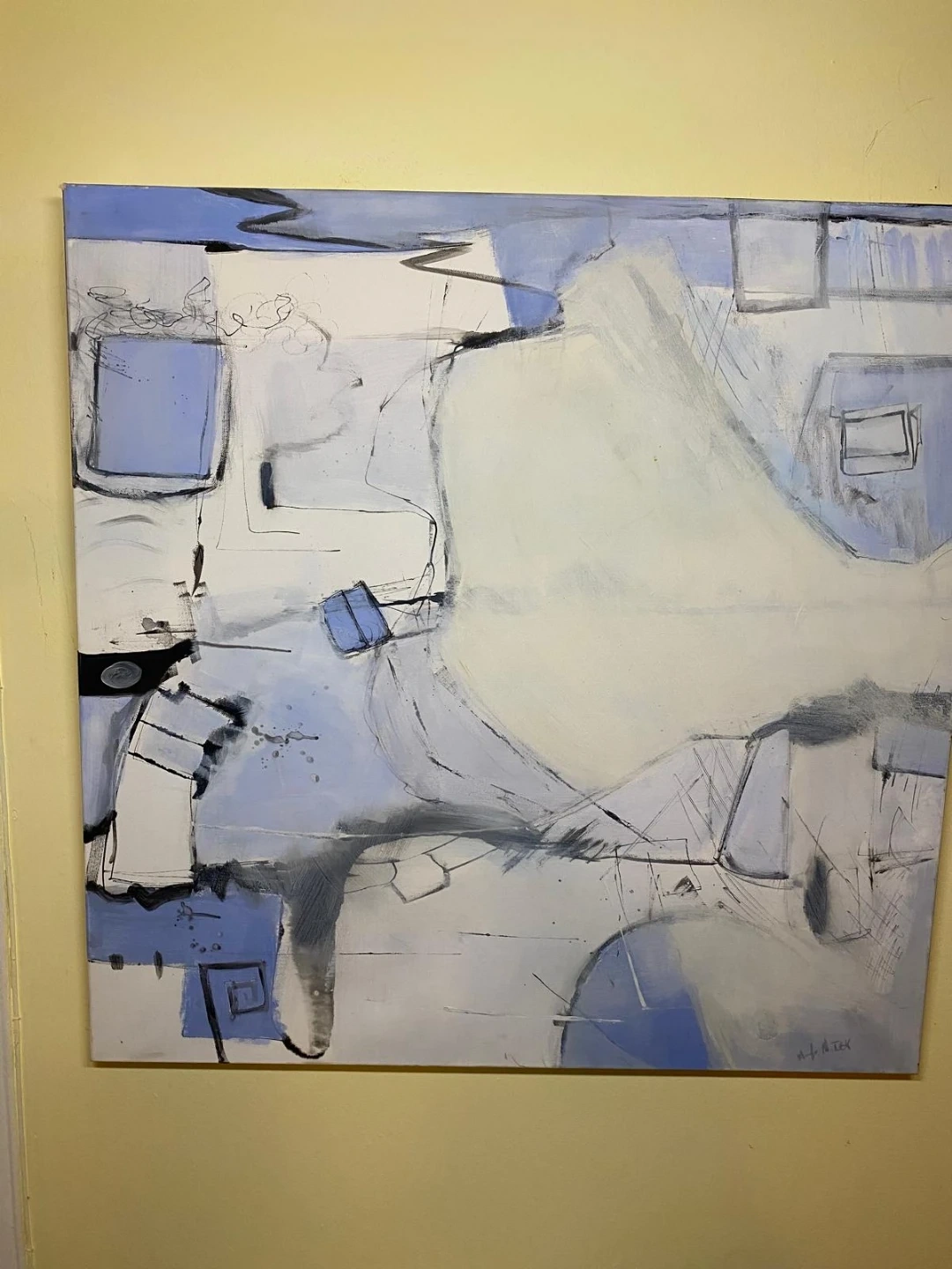Selling an abstract art painting. It measures approximately 36x36 inches. The painting features a mix of blue, white, and gray tones and has an interesting abstract design. Perfect for adding a modern touch to your home!