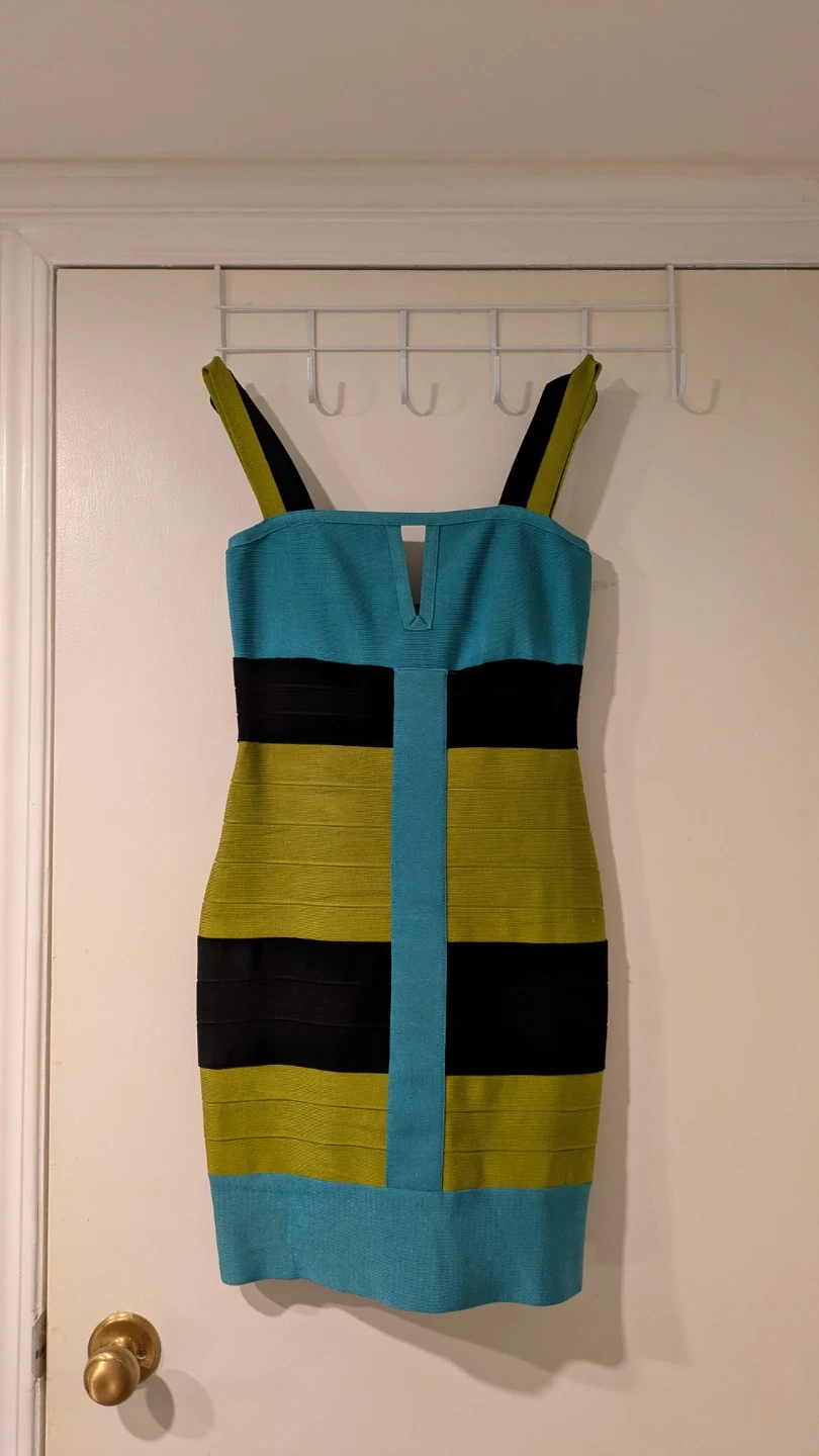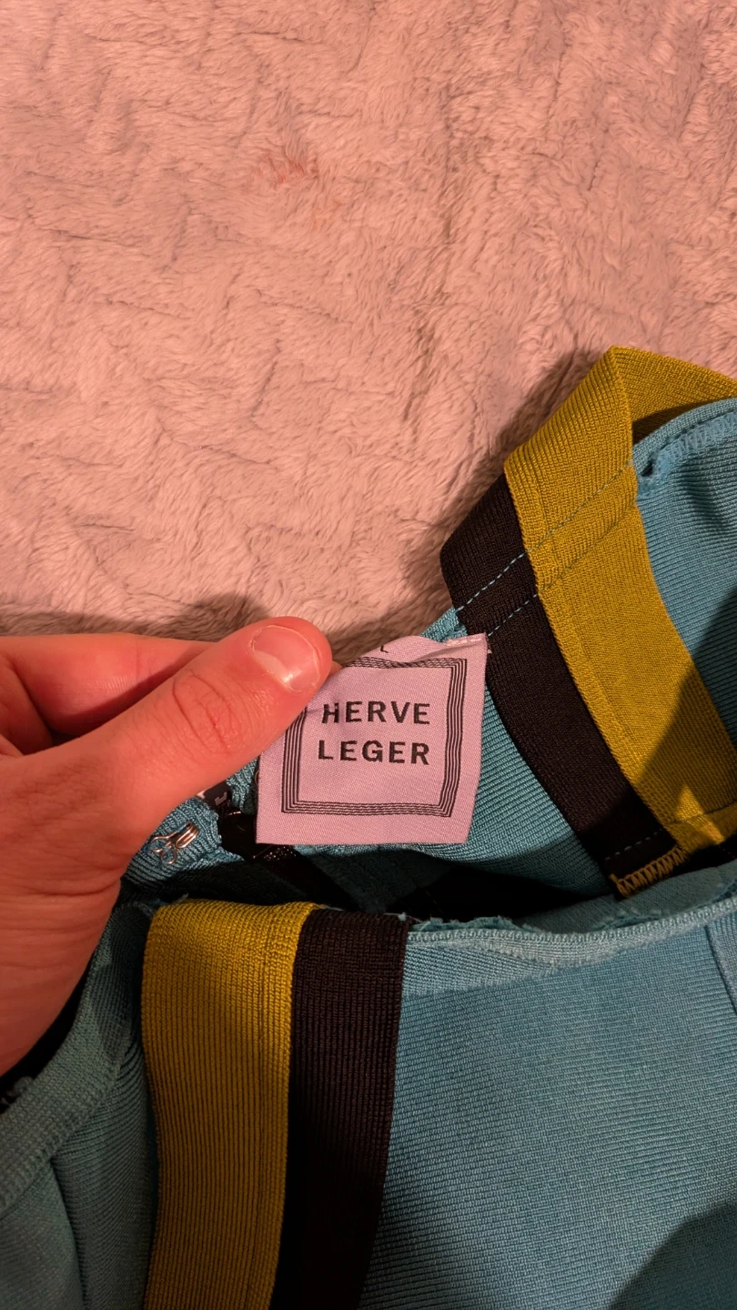 Iconic Hervé Léger bandage dress featuring a bold colour-block design in teal, olive green, and black. Designed to contour and sculpt the body with a structured, flattering fit. Perfect for events, cocktail parties, or nights out.