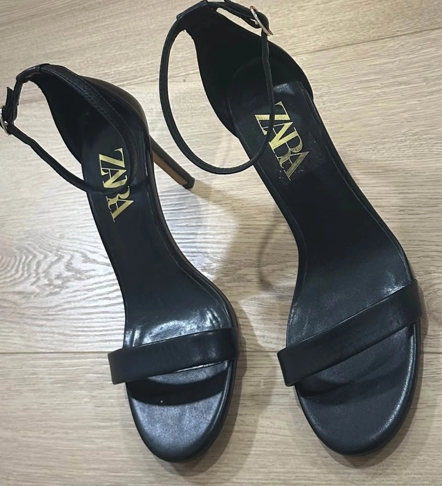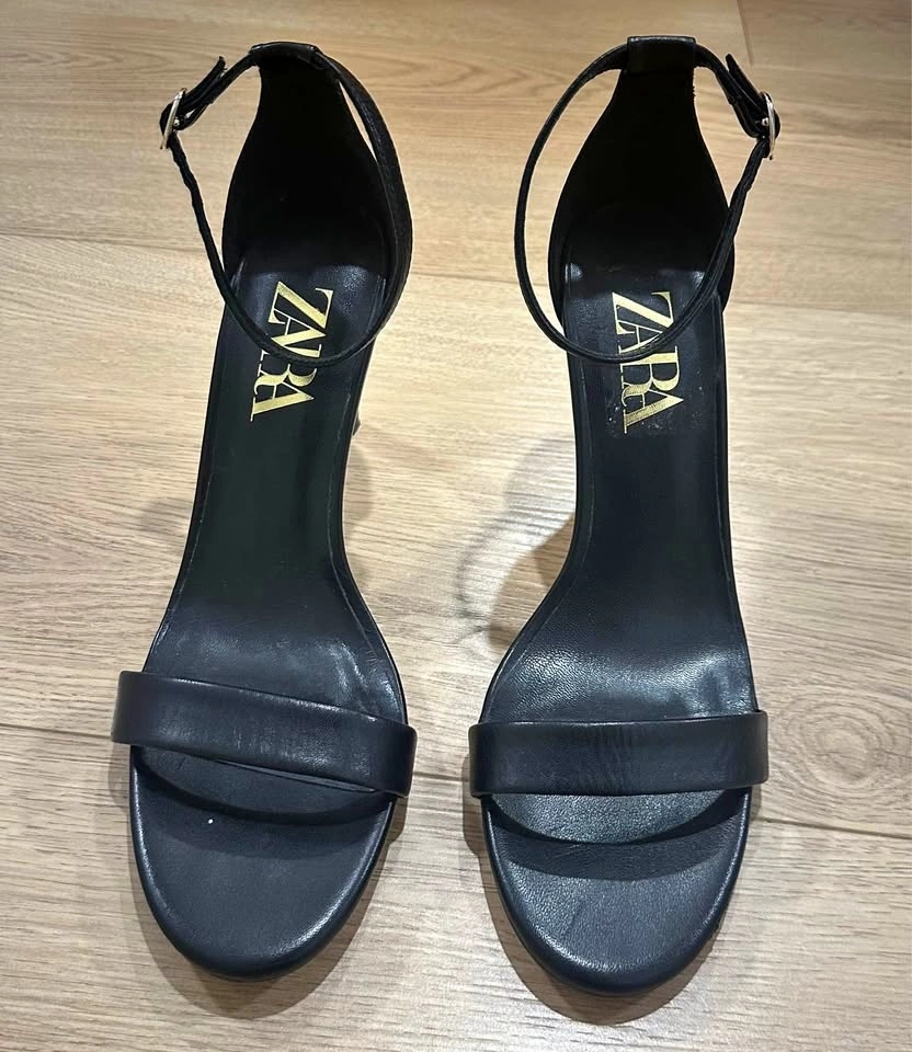 Pair of Zara black leather high-heeled sandals with an ankle strap.