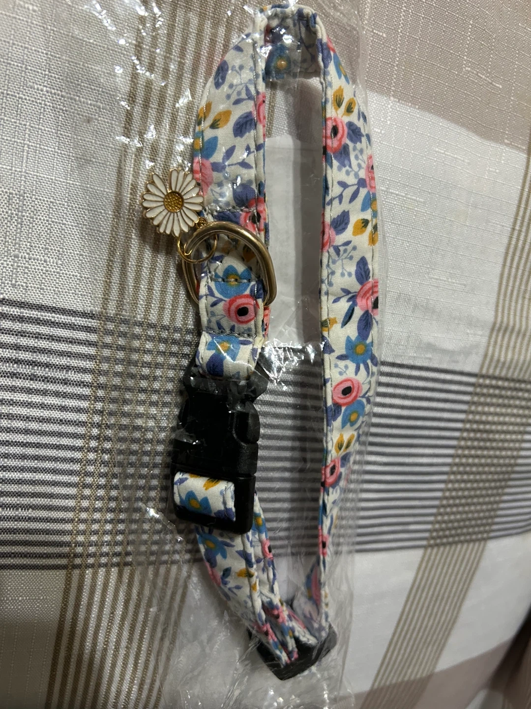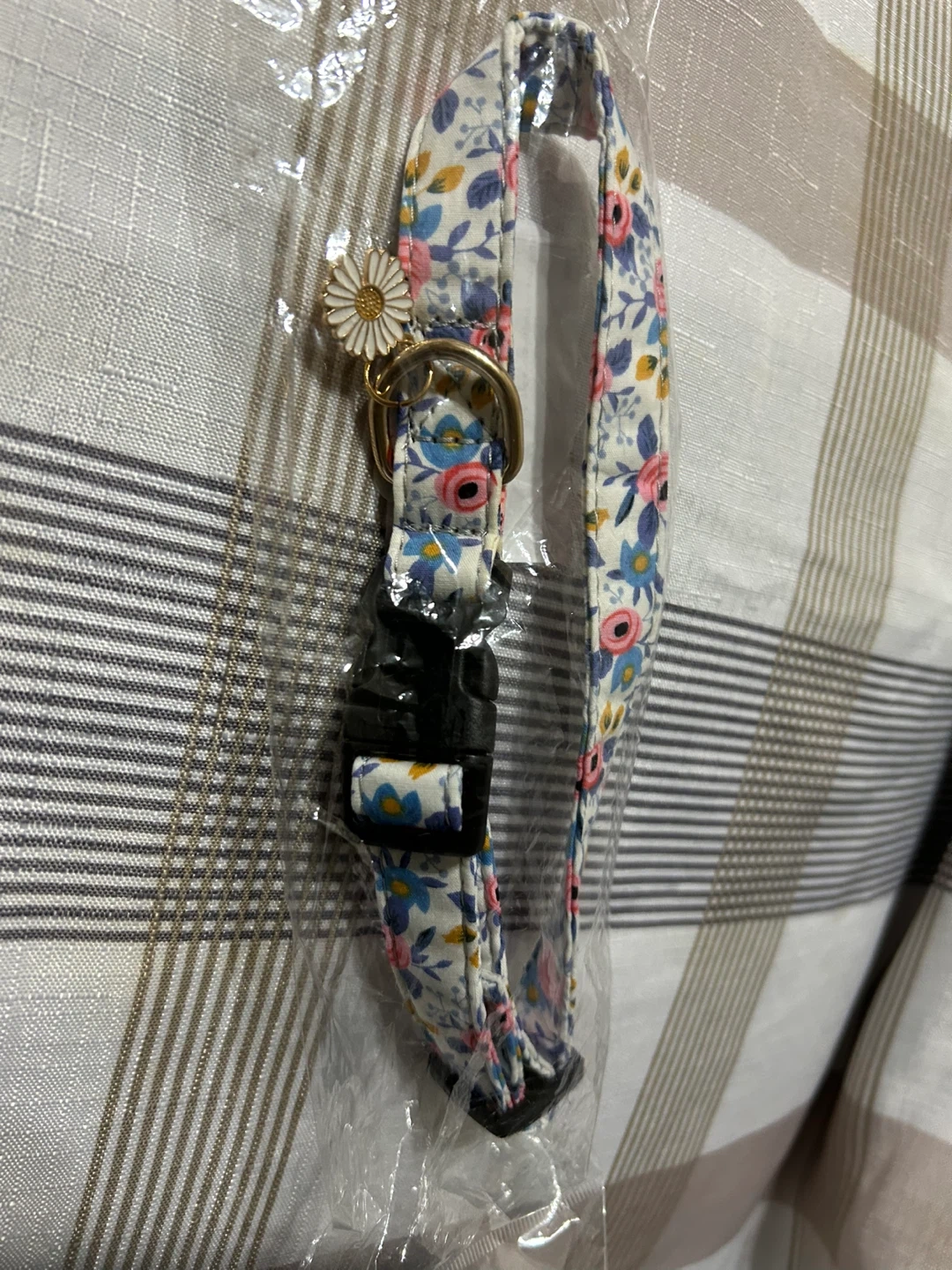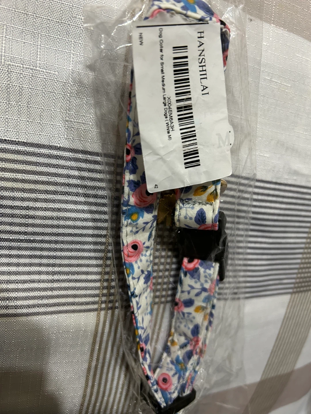 This is a new Hanshilai dog &Cat collar, still in its original packaging! It's a floral design, suitable for small, medium, and large dogs. The collar is white with a colourful floral pattern and a cute daisy charm!
