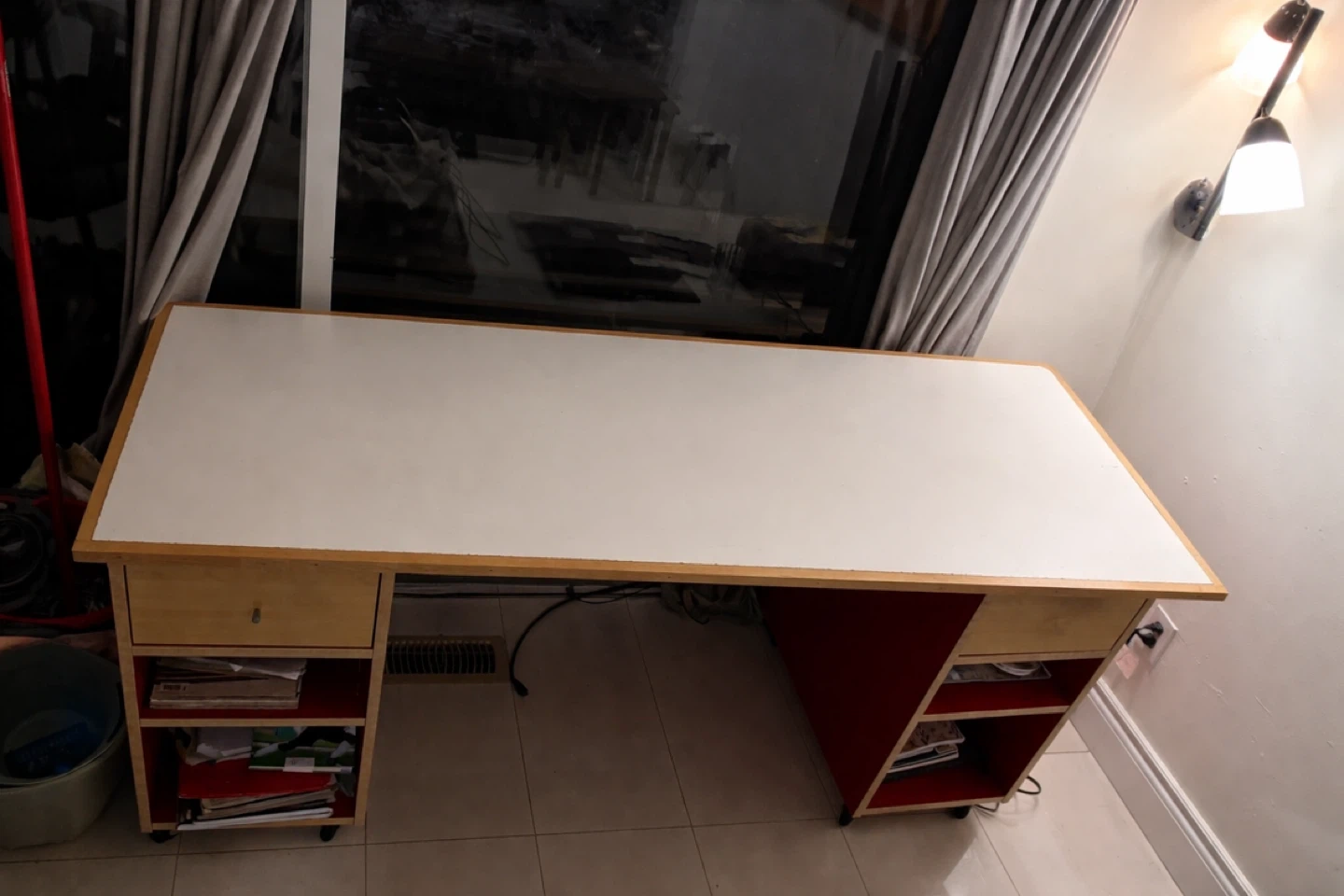 Selling a desk with a white top and storage on either side. It has a clean look and would be great for a home office or study space! It is in used condition but still fully functional and aesthetically pleasing. Please note that the top is NOT glued or screwed into the storage shelves on the sides, so the more weight you keep on either side of the desk the better.