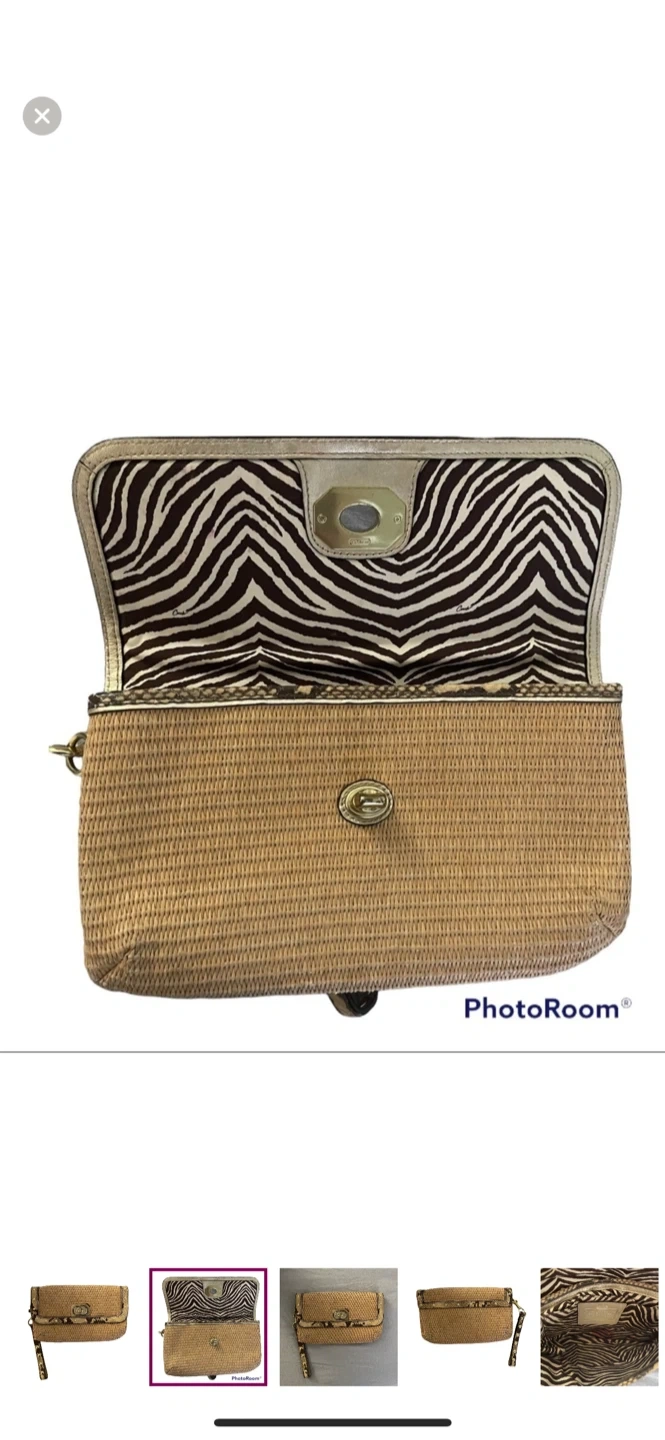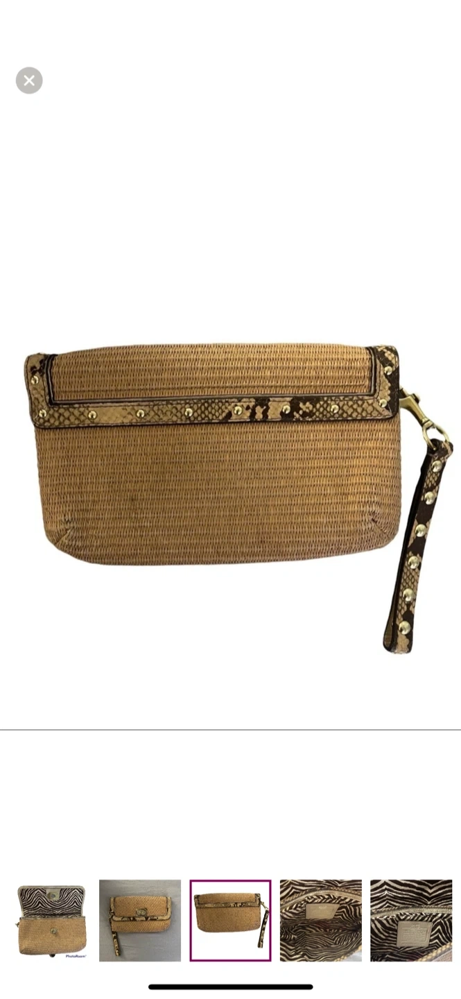 This Coach straw wristlet shows some minor signs of wear and has an ink stain on the lining but is in excellent wear now condition.
