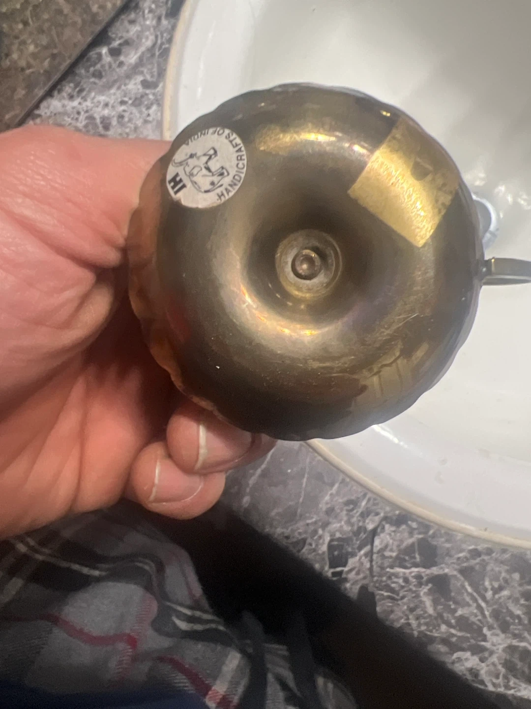 Here's a cute vintage brass candlestick holder. It has a handle and a unique design around the base. Perfect for adding a touch of vintage charm to your home! Pick up only