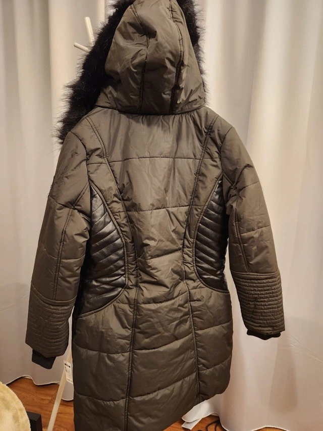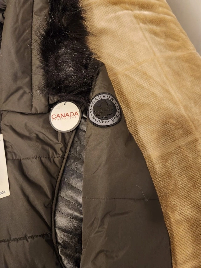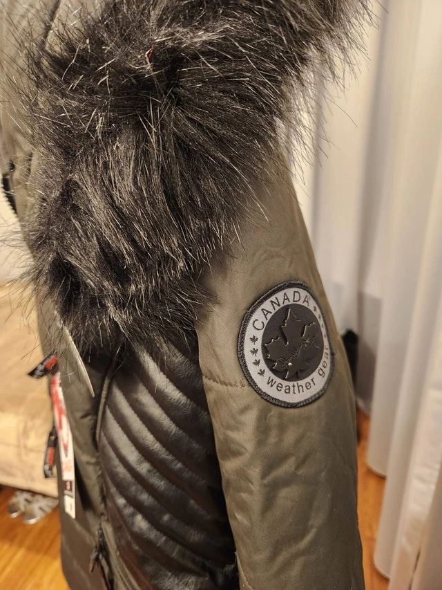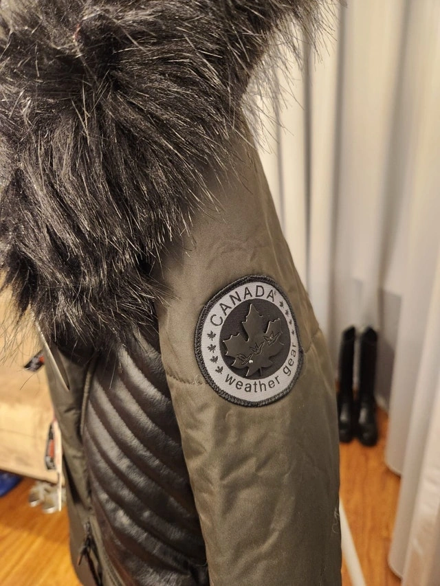 I'm selling a stylish and functional Canada Weather Gear winter coat, perfect for staying warm during the colder months, size Large. This coat features a sleek design with quilted detailing and a faux fur-trimmed hood.