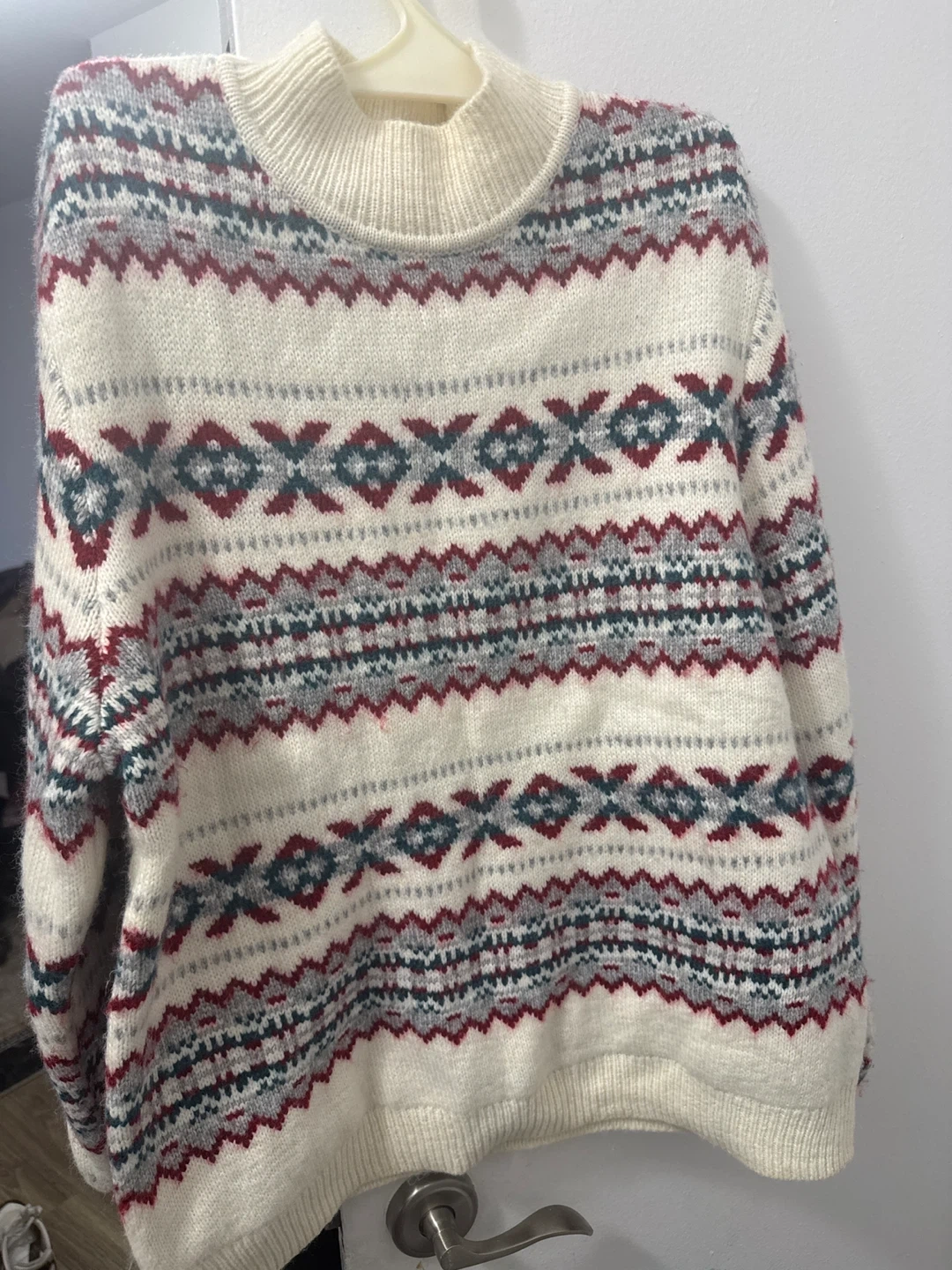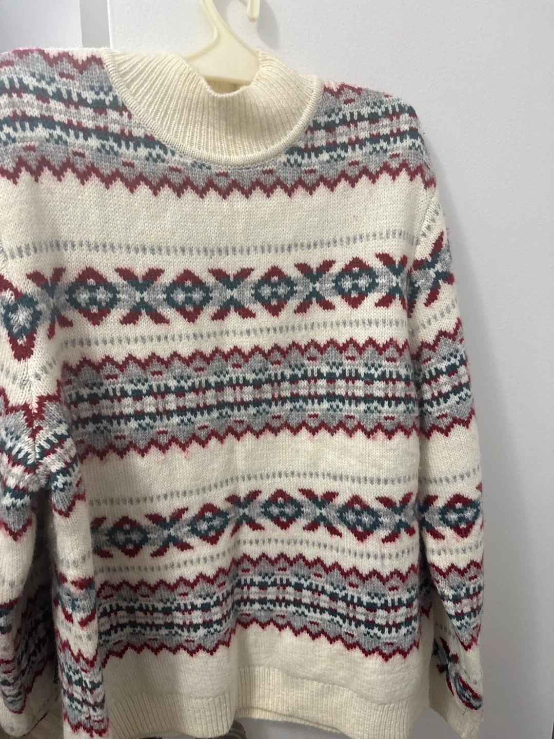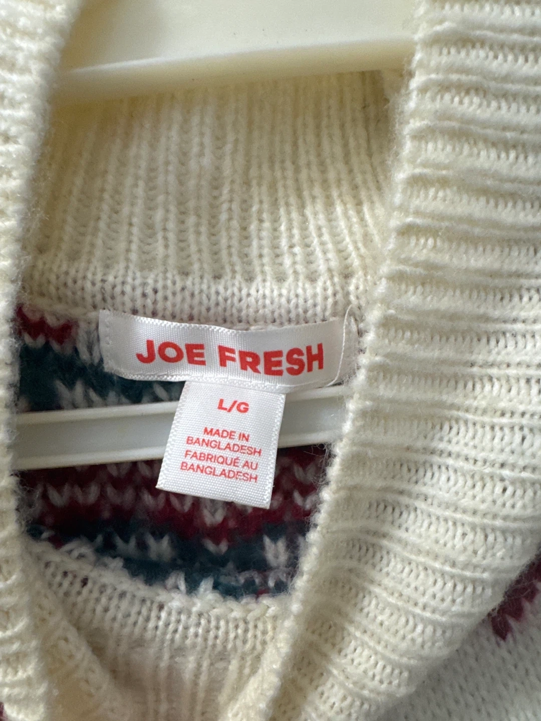 Cozy Joe Fresh knit sweater, size L/G. Features a cream base with red, grey, and teal accents in a geometric pattern. Perfect for layering!