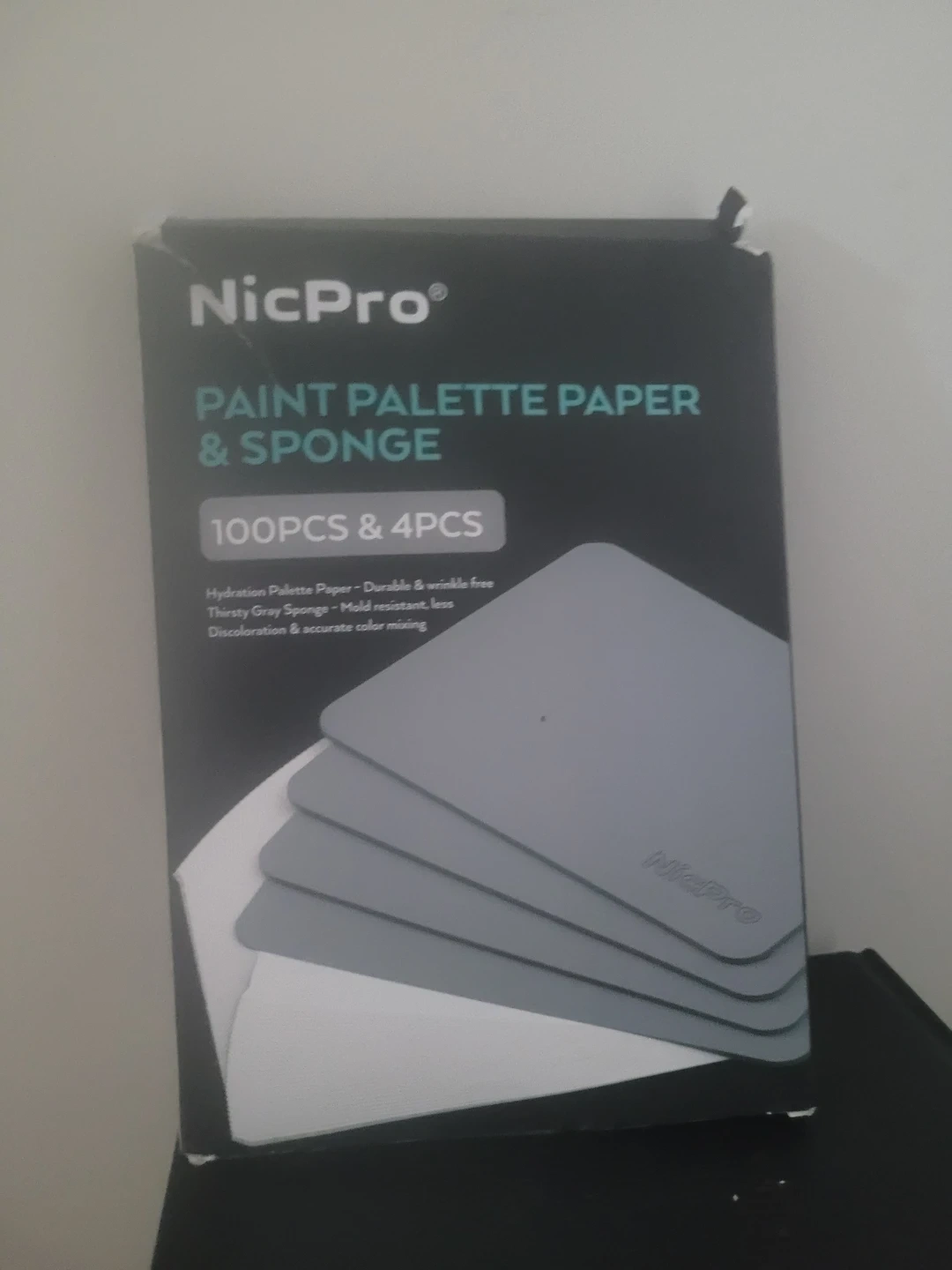 Selling a NicPro paint palette paper and sponge set. Includes 100 sheets of hydration palette paper and 4 thirsty gray sponges. The paper is durable and wrinkle-free, and the sponges are mold resistant, ensuring less discoloration and accurate colour mixing
