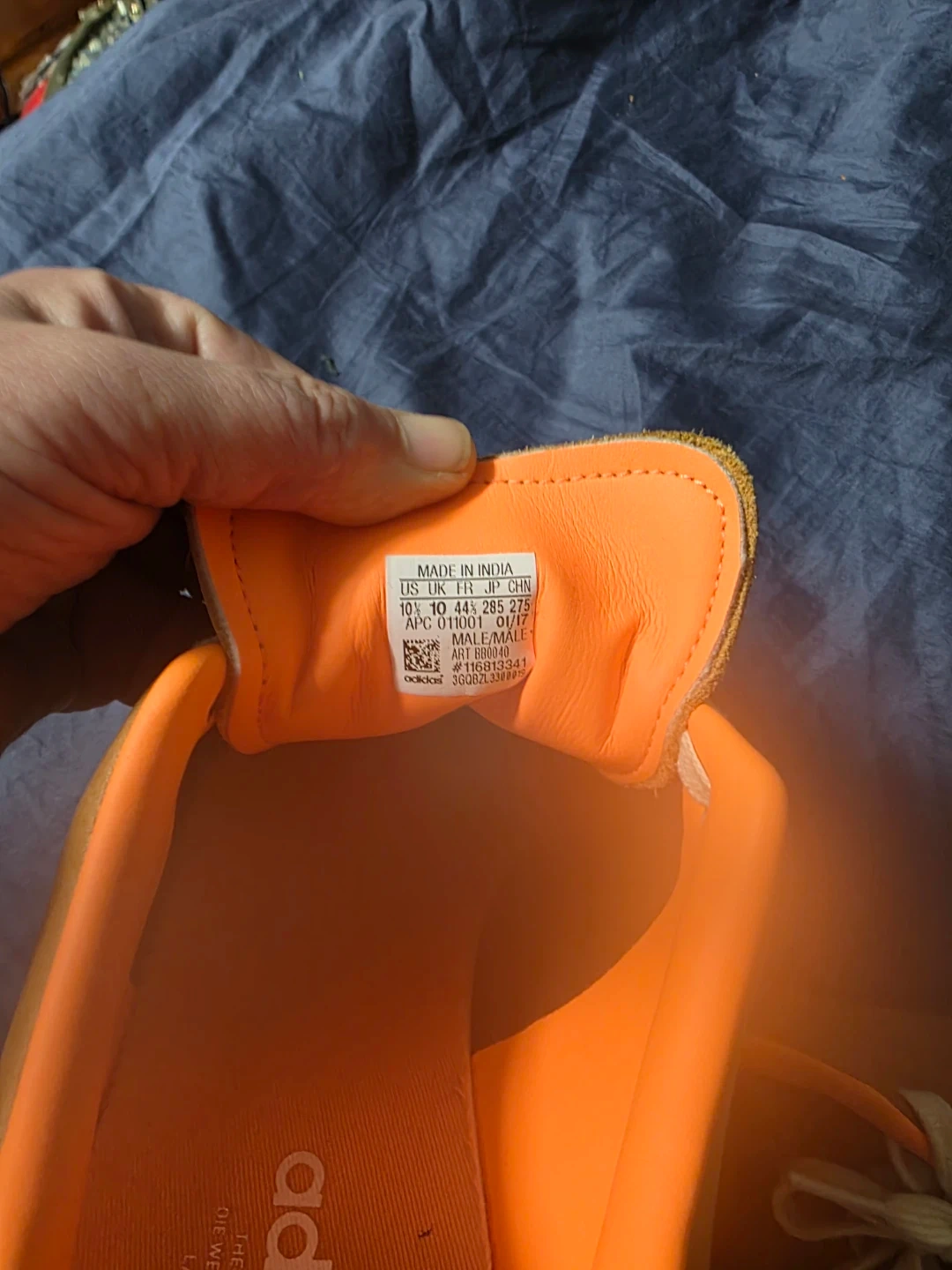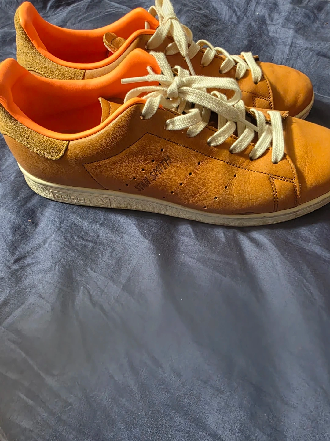 Selling a pair of Adidas Stan Smith shoes in a unique orange leather! They are a US size 10.5. The label indicates they were manufactured in January 2017. These have a classic look with a modern twist, perfect for adding a pop of colour to your wardrobe