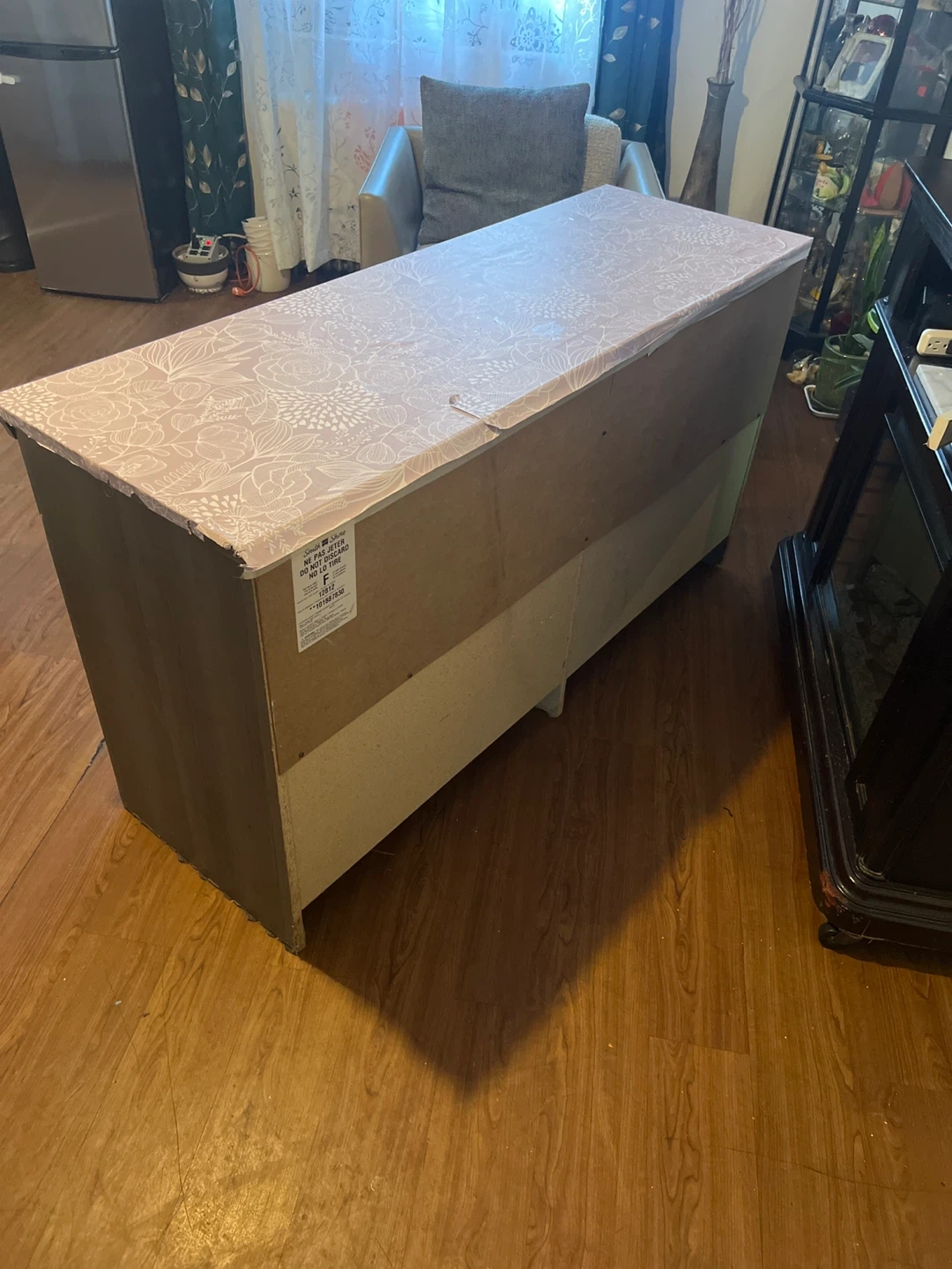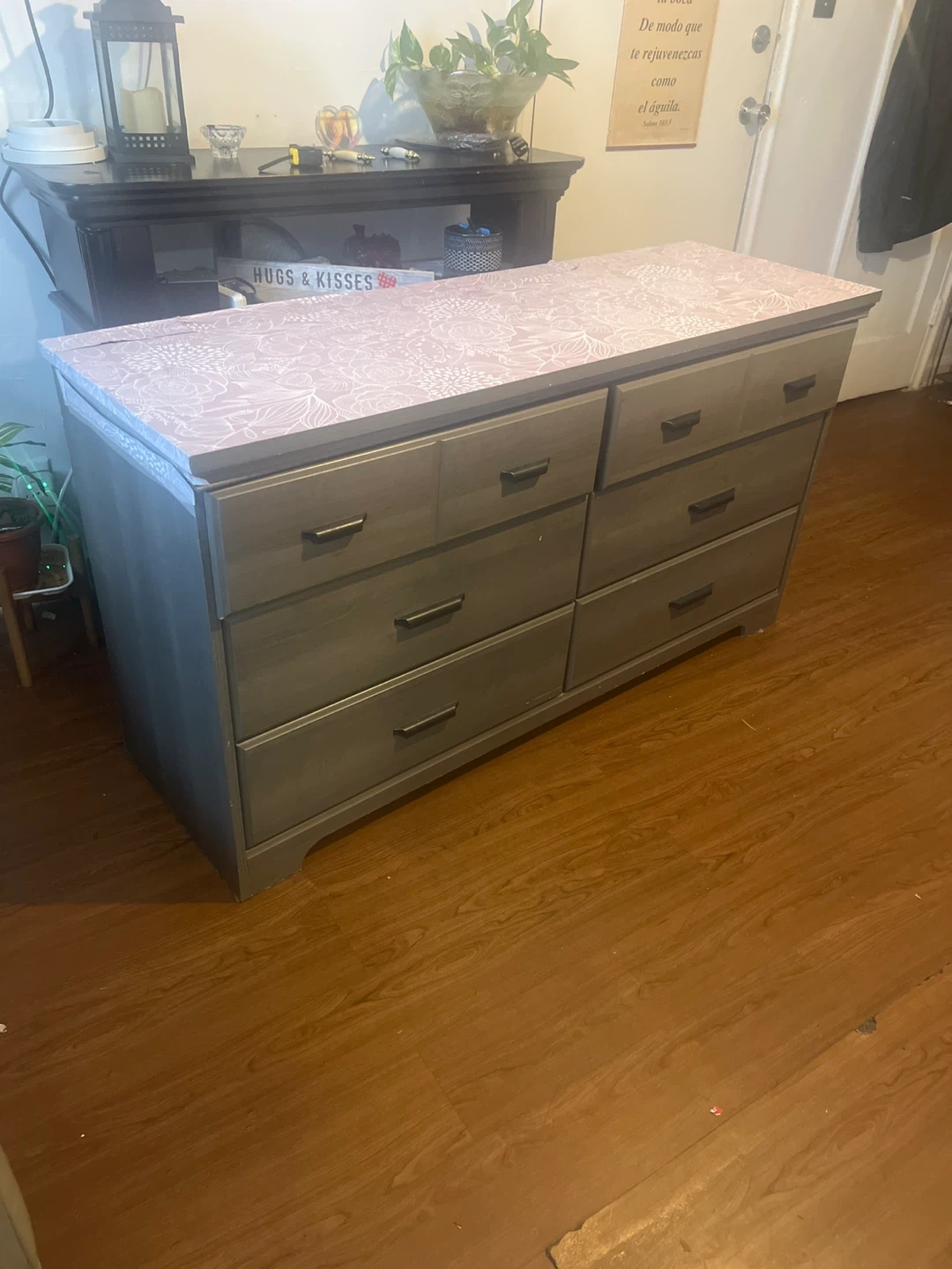 Selling a dresser with 7 drawers. It has a light gray color with a floral design on top. It's in good condition and ready for a new home!