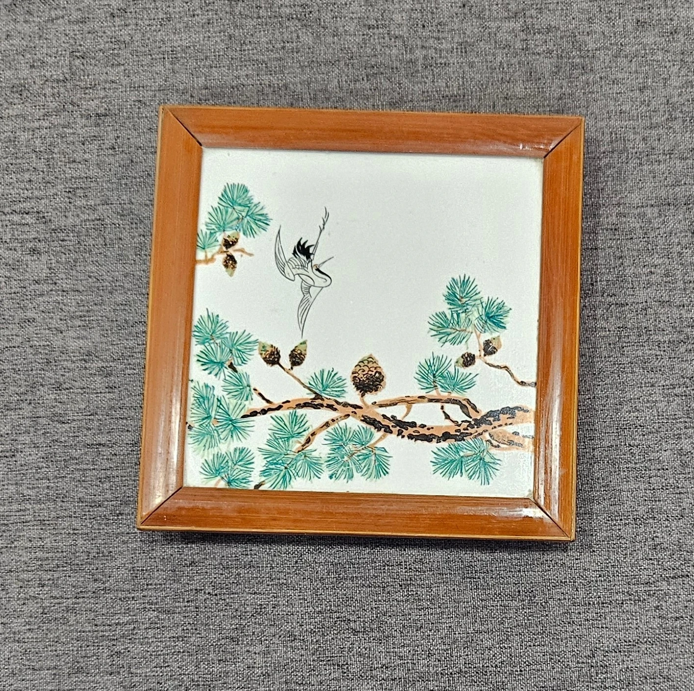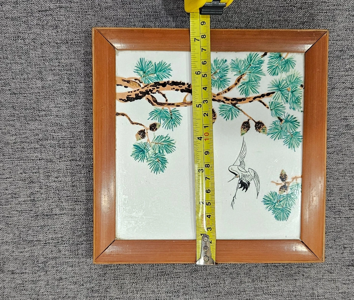 Selling a lovely vintage tile art piece in a Japanese style. It has a wooden frame. The tile itself features a crane and pine branch design. It measures approximately 8 inches square. A unique piece to add to your collection or home decor!