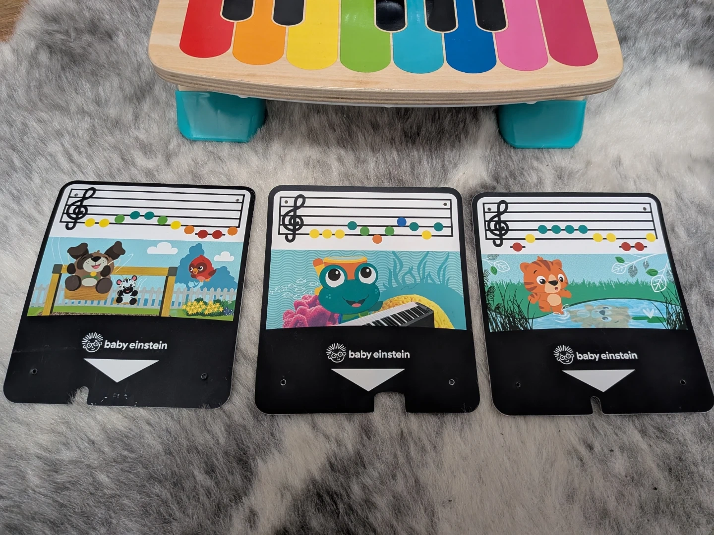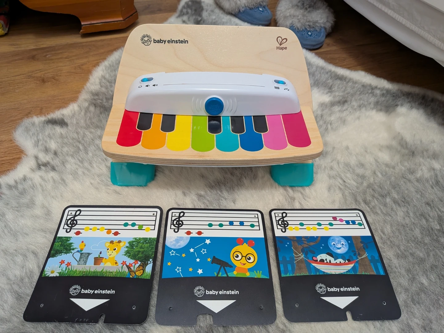 This Baby Einstein Hape Magic Touch Piano is perfect for your little one! It's in great condition and ready to make some music. The piano features a touch-sensitive surface, so there are no buttons or keys to press. It also comes with music cards to help your child learn to play simple songs