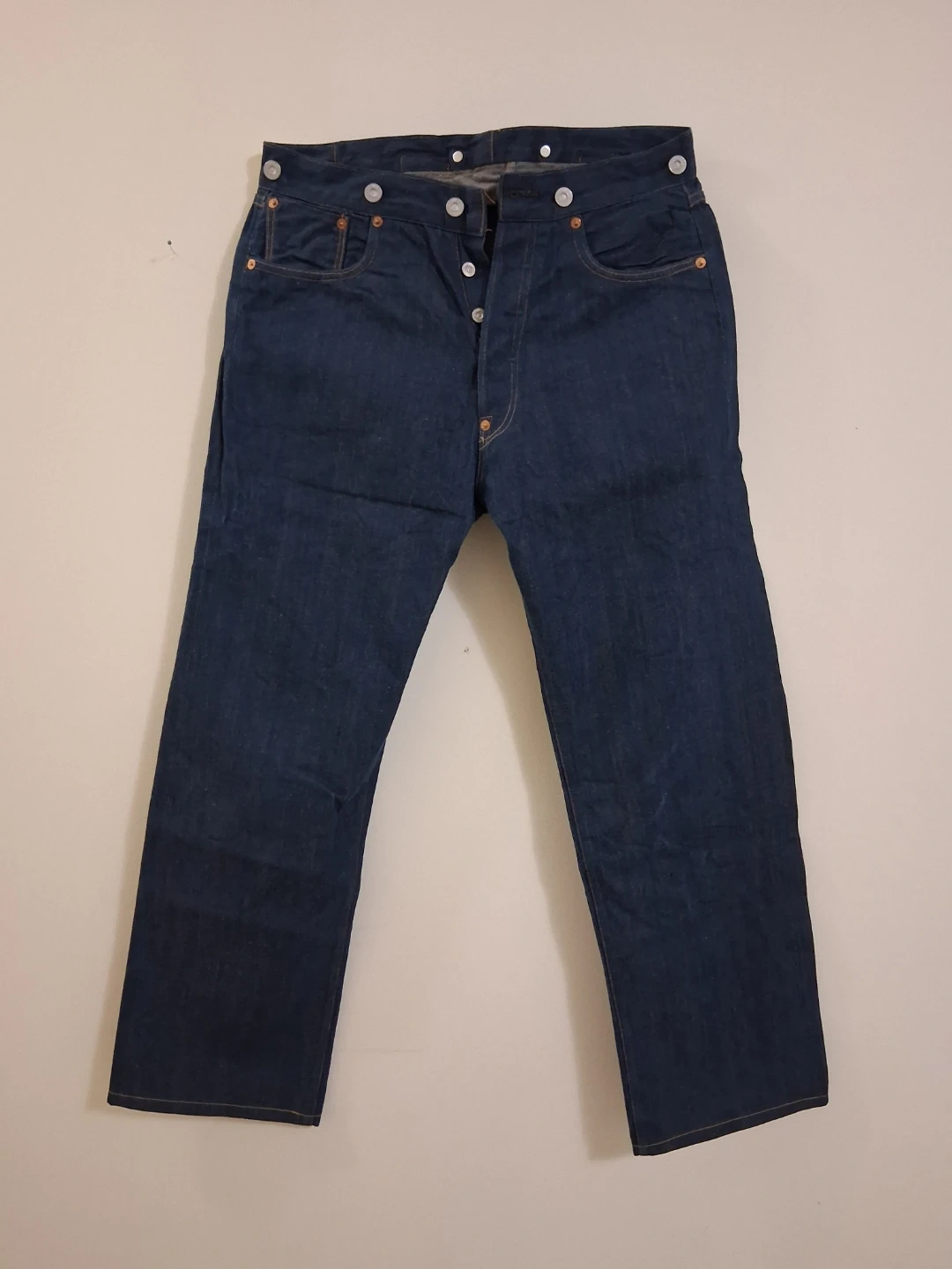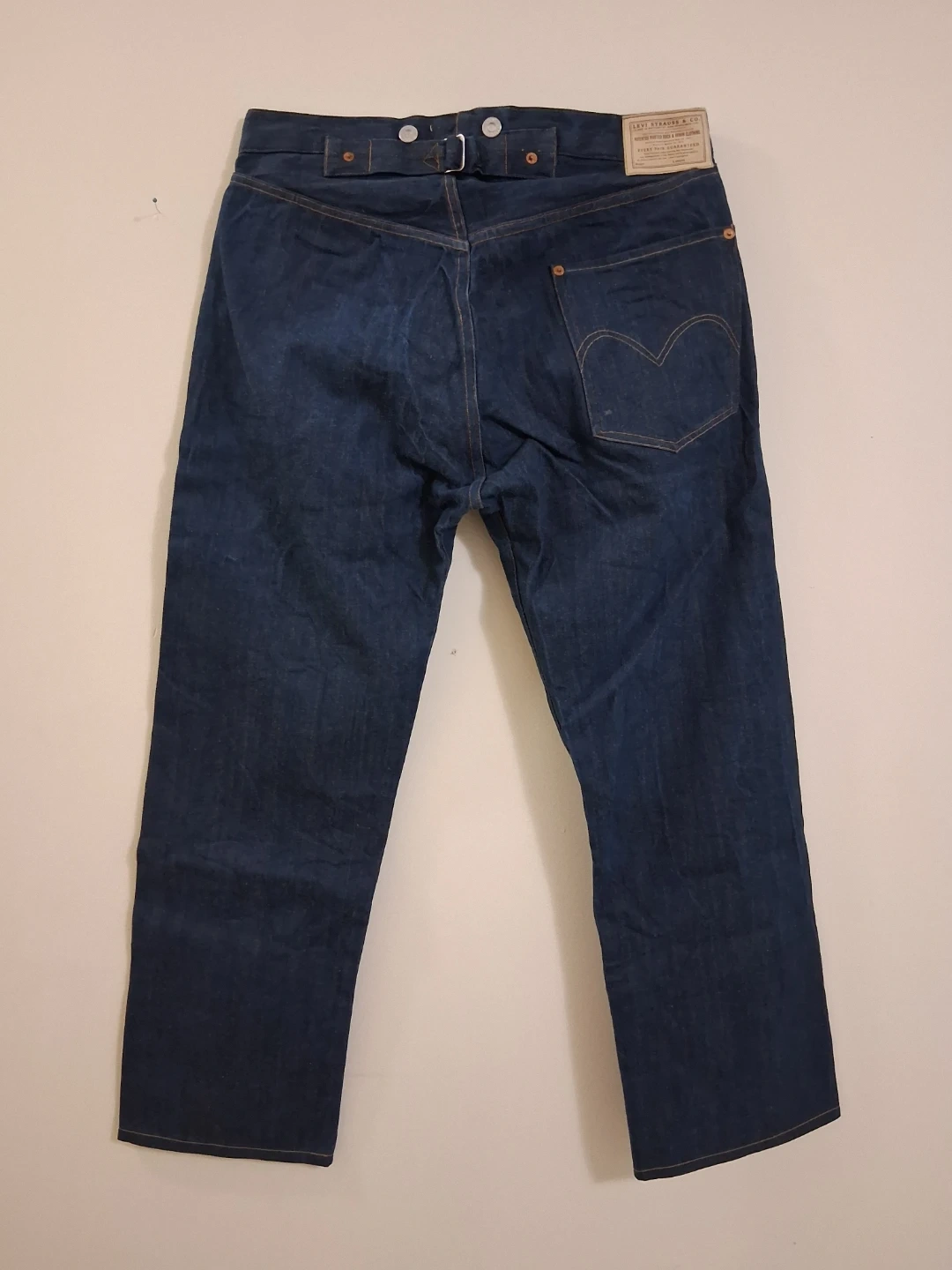 Levi's Vintage Clothing (LVC) reproduction from an early era like the 1890s, 1901, 1915, 1922, or 1933, featuring a cinch back, suspender buttons, and exposed rivets.
