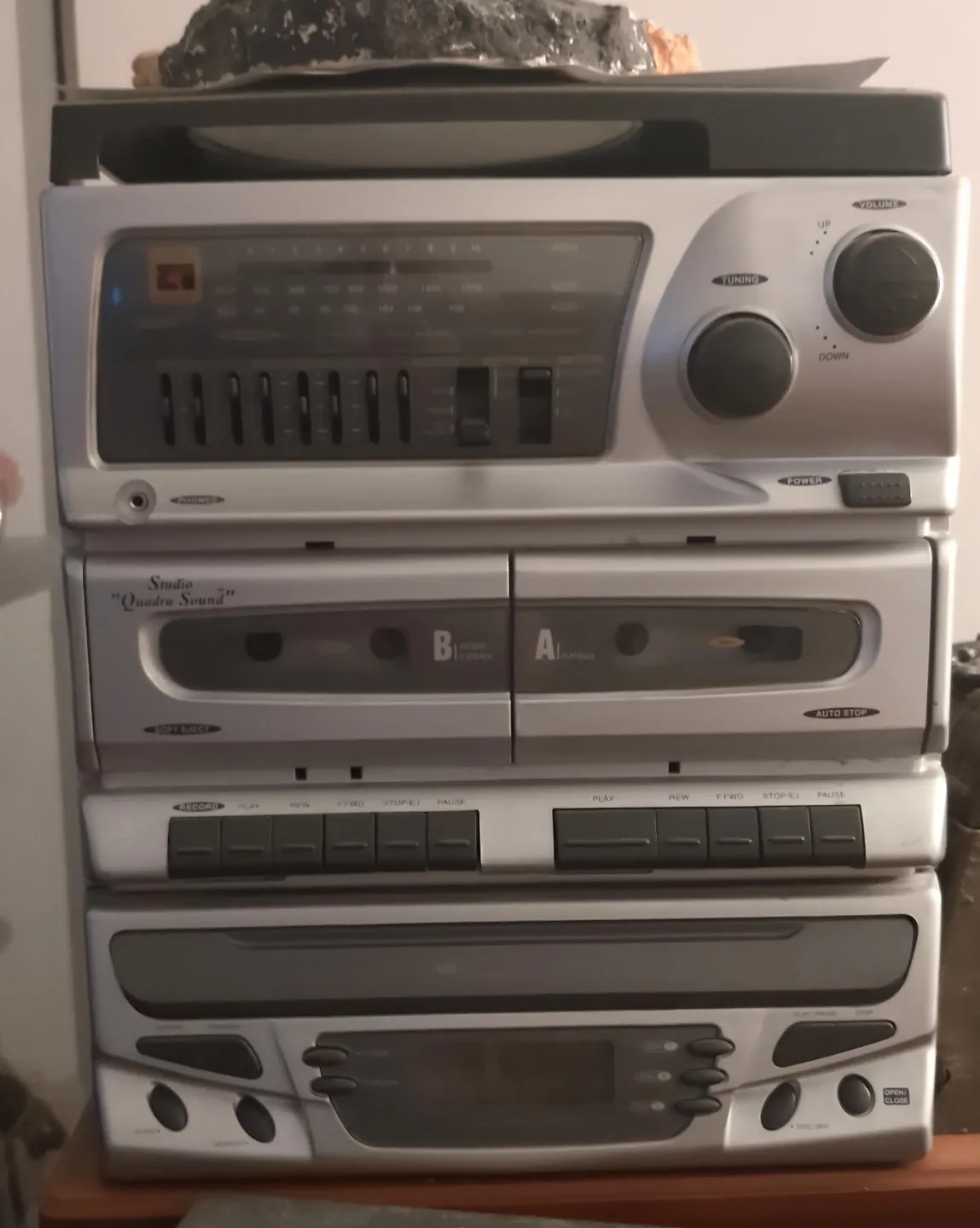Selling a Studio 'Quadra Sound' stereo system! It features a radio, cassette player, and what looks like a CD player. It has tuning and volume knobs, along with playback controls for the cassette players and CD player. Perfect for someone who enjoys vintage audio equipment