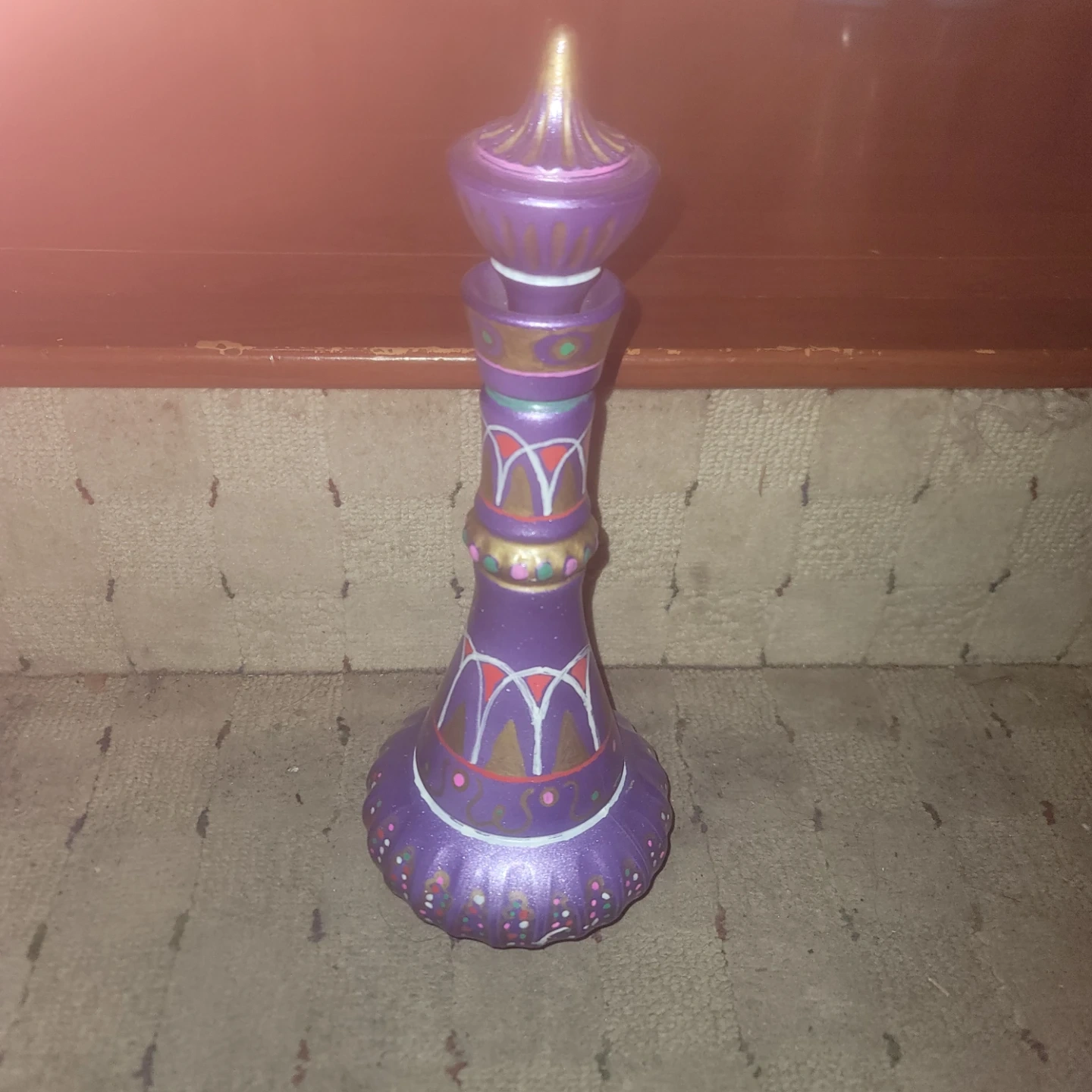 A beautiful I dream of Jeannie Genie bottle! It has a unique design with gold, white, and red accents. It would be a great addition to any room who loves tv props