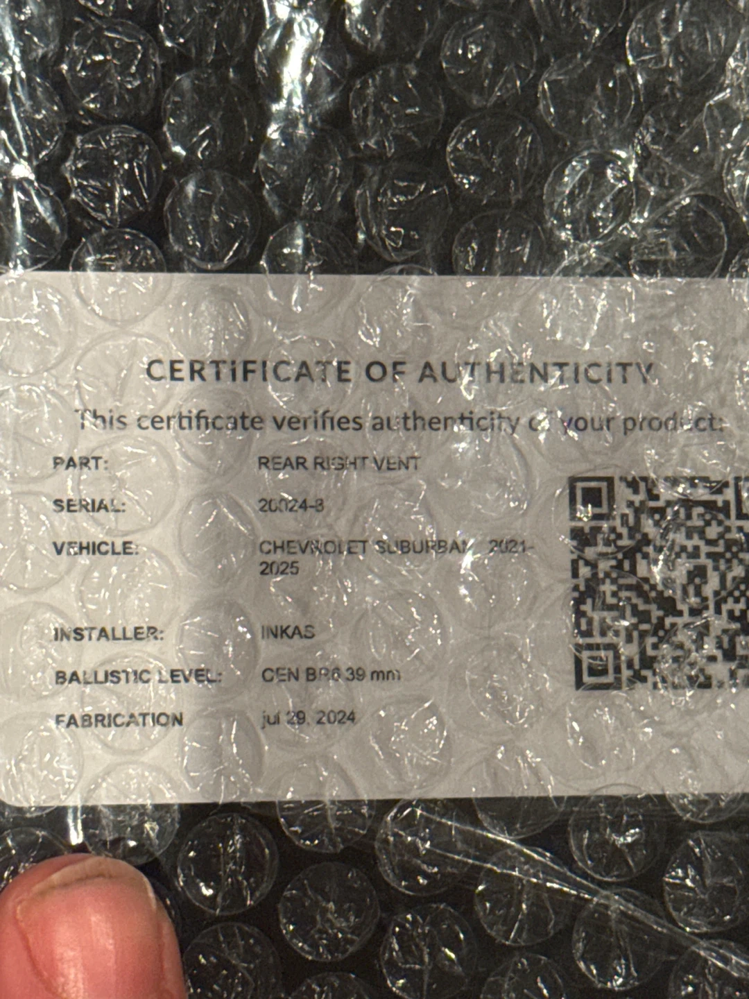 Selling a rear right vent for a Chevrolet Suburban (2021-2025) made by INKAS. The fabrication date is July 29, 2024. Ballistic level is CEN BR6 (.39 mm).