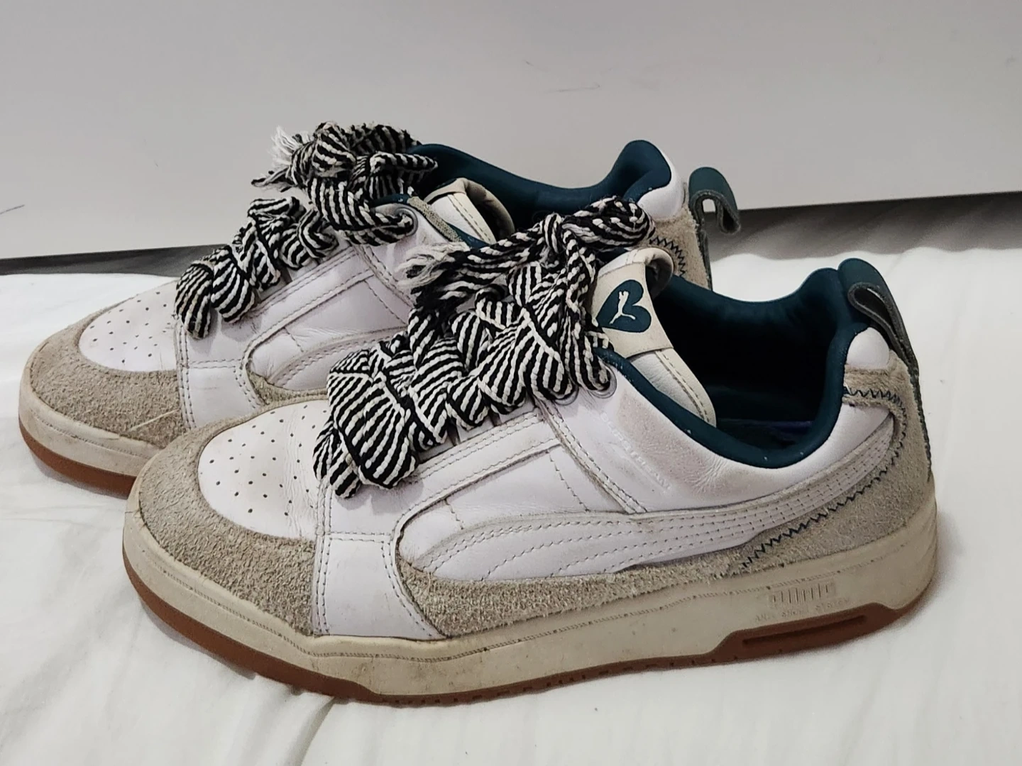 Selling a pair of Puma sneakers in white and grey. They show some signs of wear, as pictured. The laces are black and white striped. Size UK 5, EUR 38, US 6, CA 6