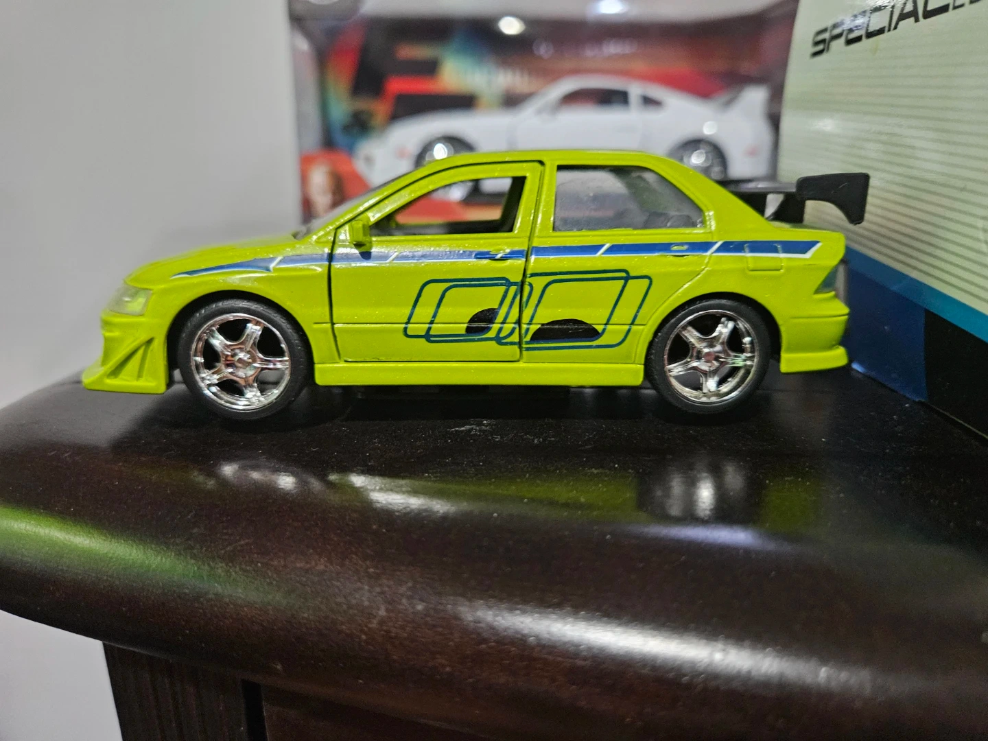 Selling a diecast model of Brian's Mitsubishi Lancer Evolution VII from The Fast and the Furious! It's a cool collectible for any fan of the movie or diecast cars in general. The car is green with blue accents and looks great on display