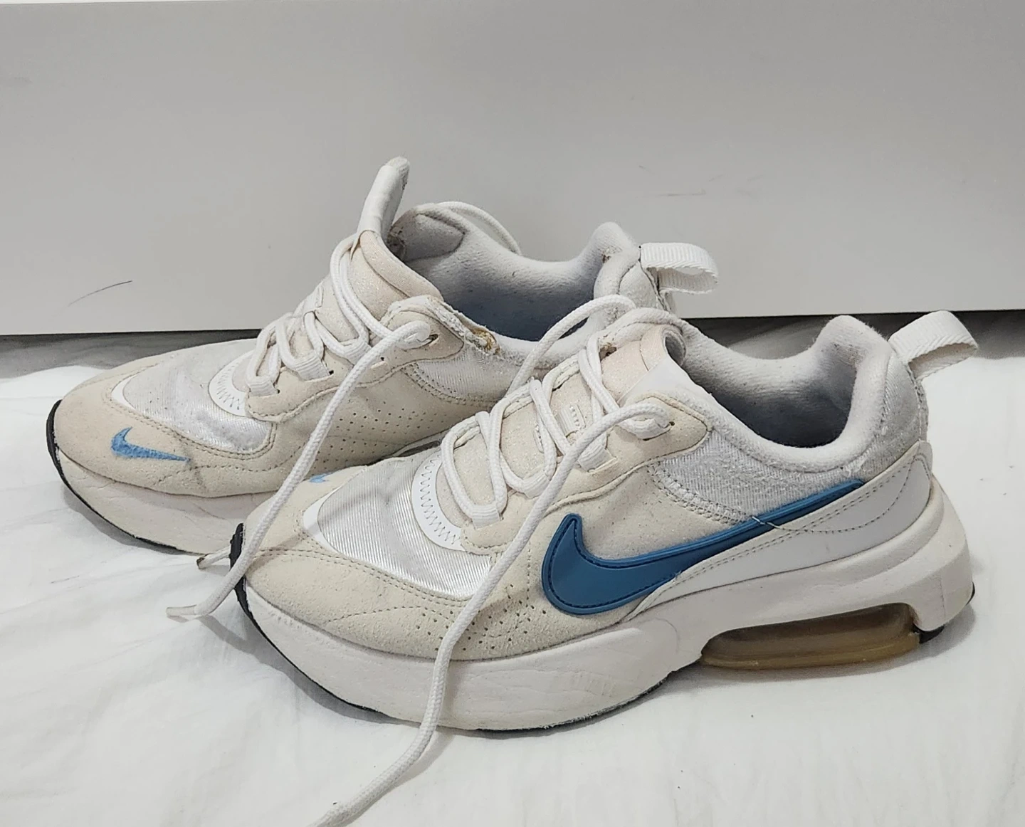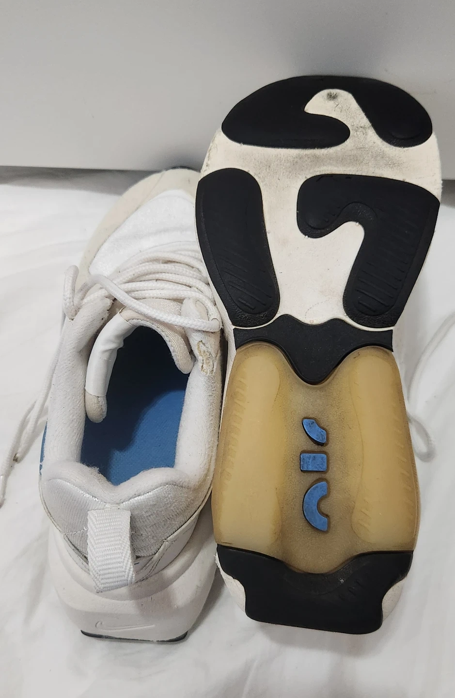 Selling a pair of Nike Air Max 200 sneakers in white with blue accents. They show some signs of wear, as you can see in the photos, but still have lots of life left in them. Great for everyday wear or workouts! Size US 6.5 UK 4 EUR 37.5