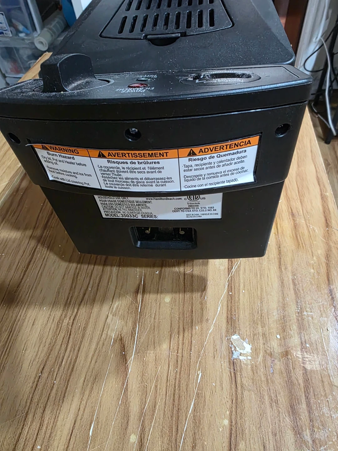 Selling a Hamilton Beach deep fryer. It's in good condition and ready for your favourite fried foods. Features a hot surface warning and model number 59350C SERIES