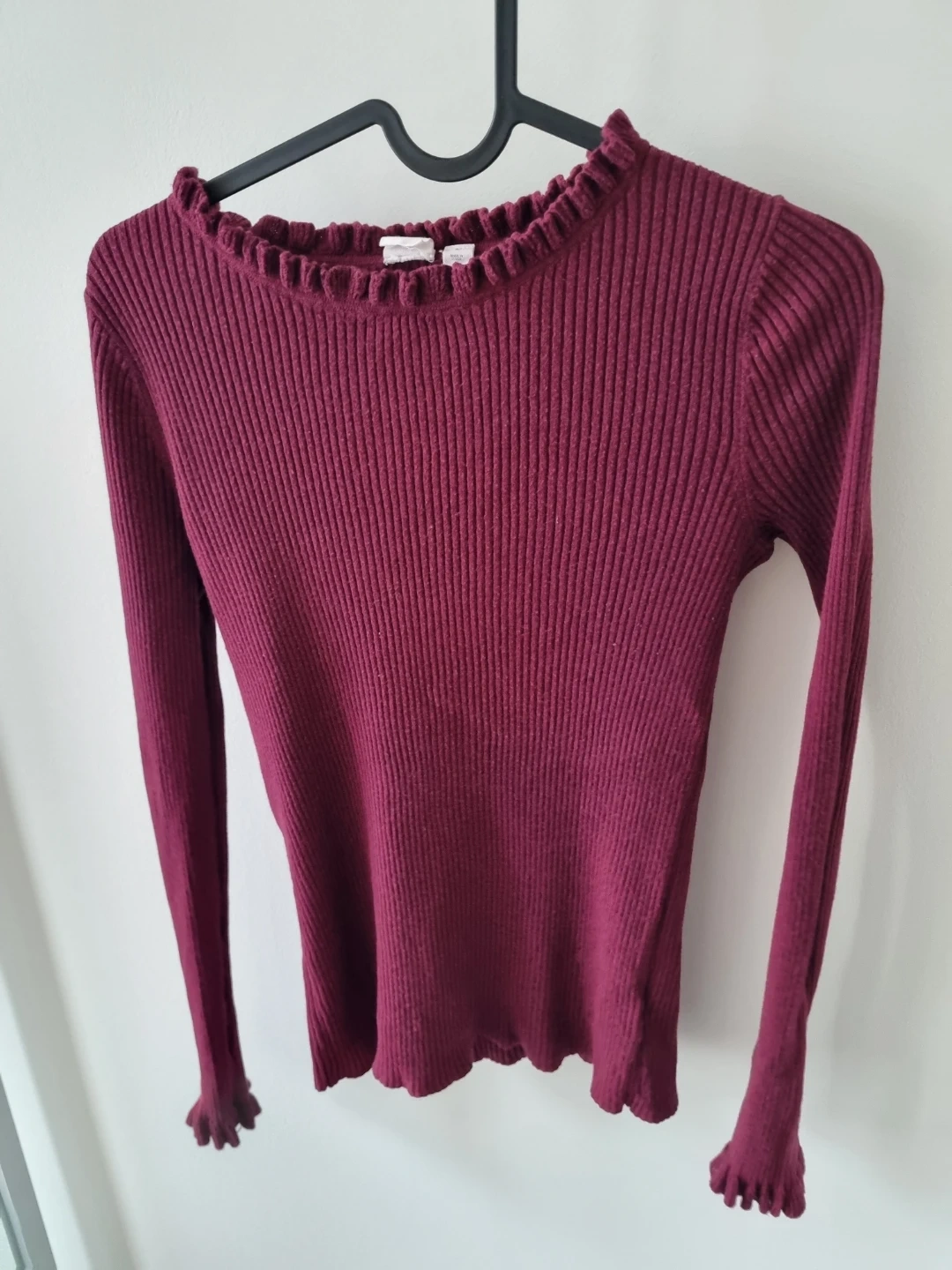A cute burgundy long-sleeve top from Gap. It features a ribbed texture and a delicate ruffle trim around the neck and cuffs. Perfect for layering or wearing on its own.