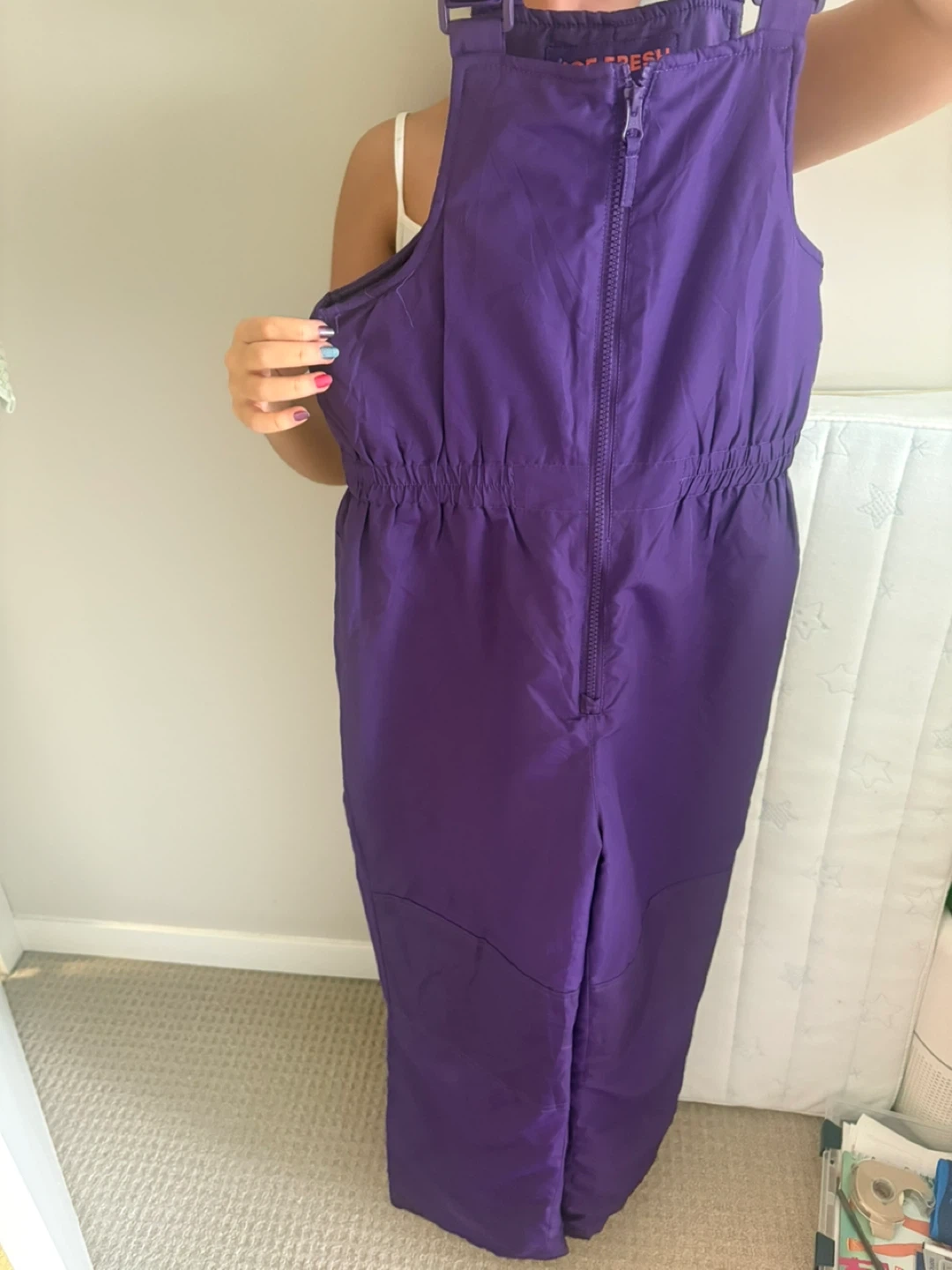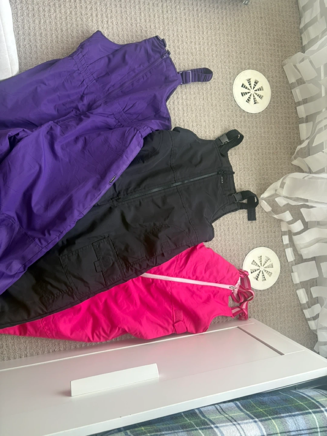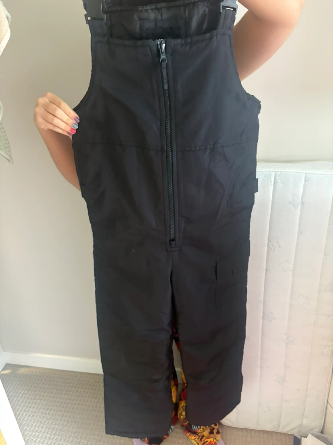 Selling a pair of kids' snow bibs in black. Great for keeping your little one warm and dry during winter activities. Available in black, purple and pink.