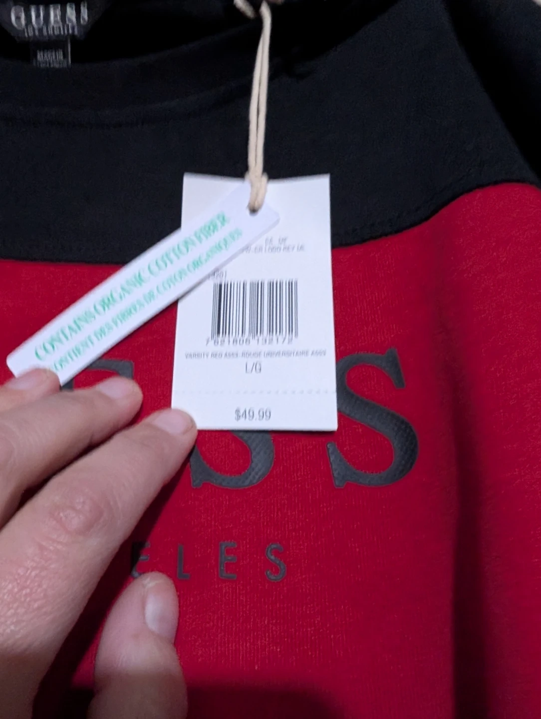 This is a brand new Guess Varsity Red A565 top in size L! The tag shows it was originally $49.99. It's a stylish long-sleeved shirt with a black and red color. $ 15 firm and pick up in Niagara falls