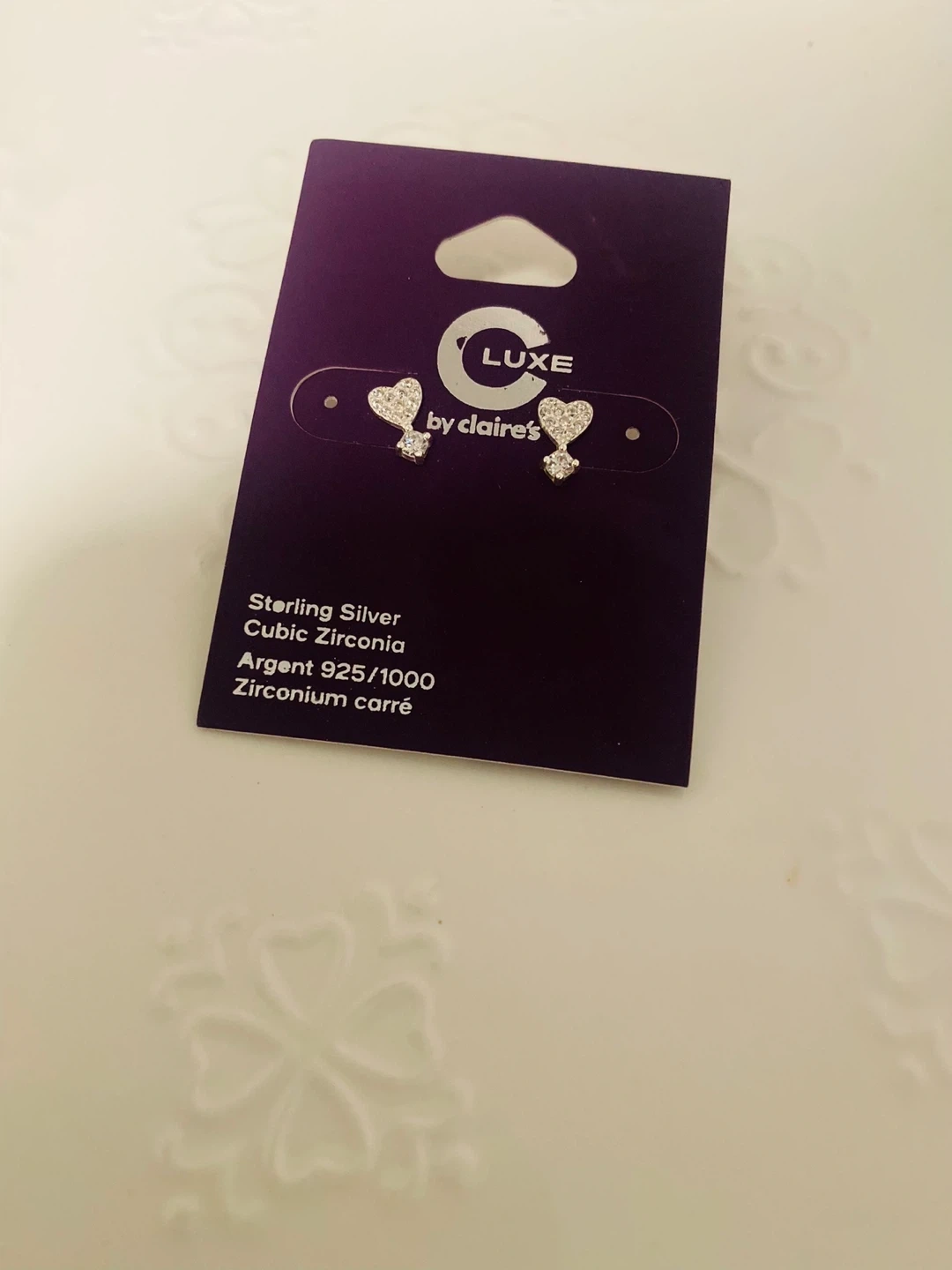 These adorable heart earrings are from Luxe by Claire's! They're made of sterling silver and cubic zirconia, adding a touch of sparkle to any outfit. The silver is Argent 925/1000, ensuring quality and durability.
