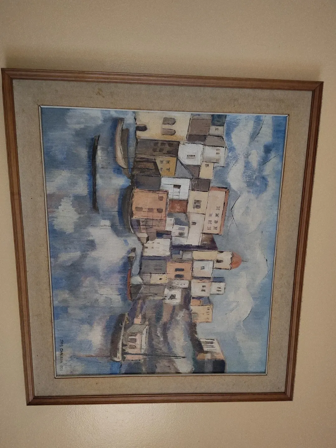 Selling a framed painting by Jims Carlson. The painting depicts a seaside village scene in a unique style. It's a great piece to add some character to your home!