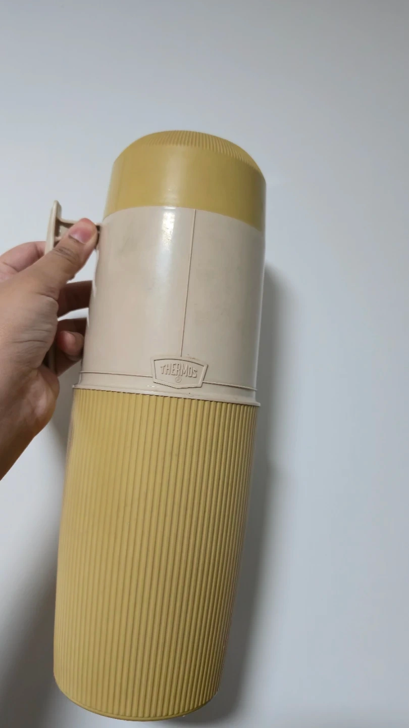 Selling a vintage Thermos bottle in beige and brown. It's in good condition and perfect for keeping your drinks hot or cold. Great for picnics, camping, or just everyday use!