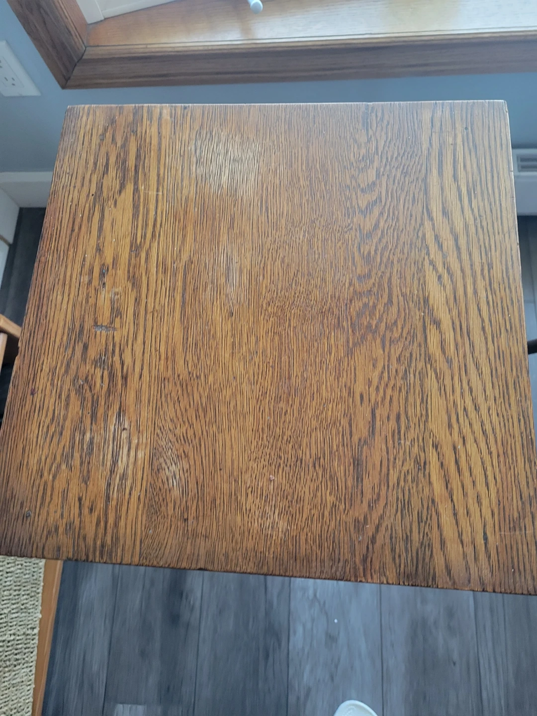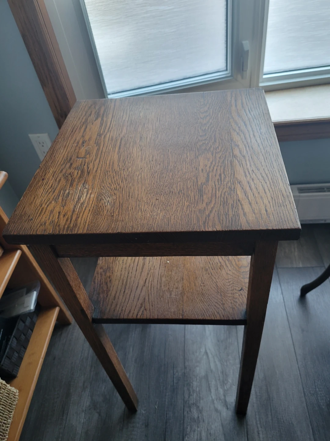 I'm selling a wooden side table. It has a square top and a shelf underneath. Perfect for a small space!29 inches high 14 inches wide shelf 12 inches Needs to be tightened Pick up lower Stoney Creek
