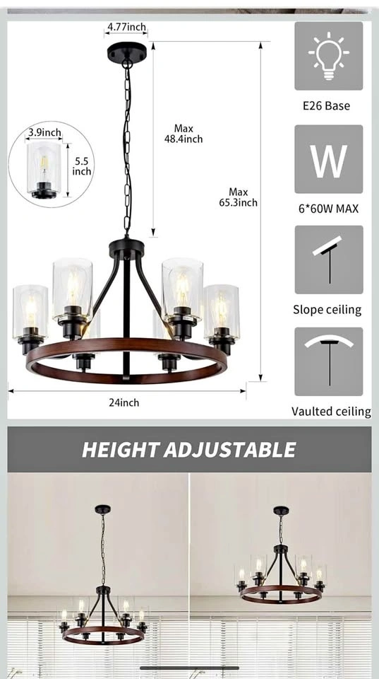 【Adjustable Height】The dining room light fixture comes with 2 metal chain(one is 70cm, the other is 50cm). The total lenght is 47.24inch( 120cm). You can adjust the length as needs to create a perfect look and decor home. Also you can install the farmhouse chandelier on flat, sloped or vaulted ceilings.