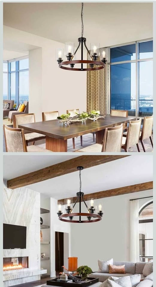 【Rustic Farmhouse Design】The 6-light farmhouselight fixture comes in a wagon wheel-inspired round frame with wood grain finish and transparent glass shades, showing a strong farmhouse country style. Perfect as ceiling hanging light fixtures for dining room, kitchen, living room, bedroom, foyers, entryway or any space you like.
