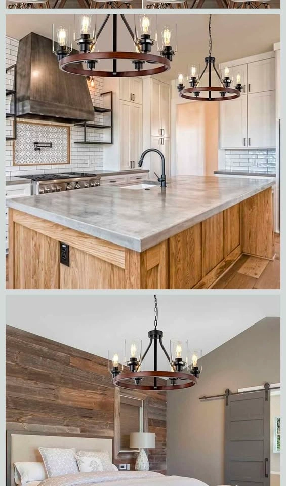 【Rustic Farmhouse Design】The 6-light farmhouselight fixture comes in a wagon wheel-inspired round frame with wood grain finish and transparent glass shades, showing a strong farmhouse country style. Perfect as ceiling hanging light fixtures for dining room, kitchen, living room, bedroom, foyers, entryway or any space you like.