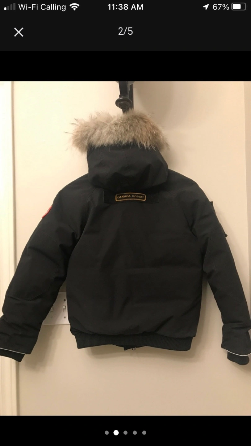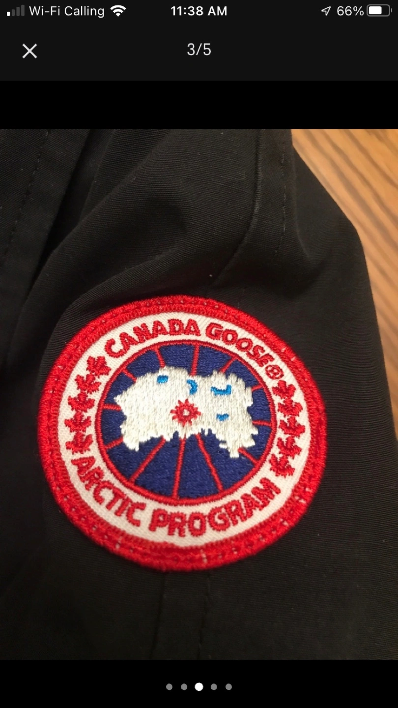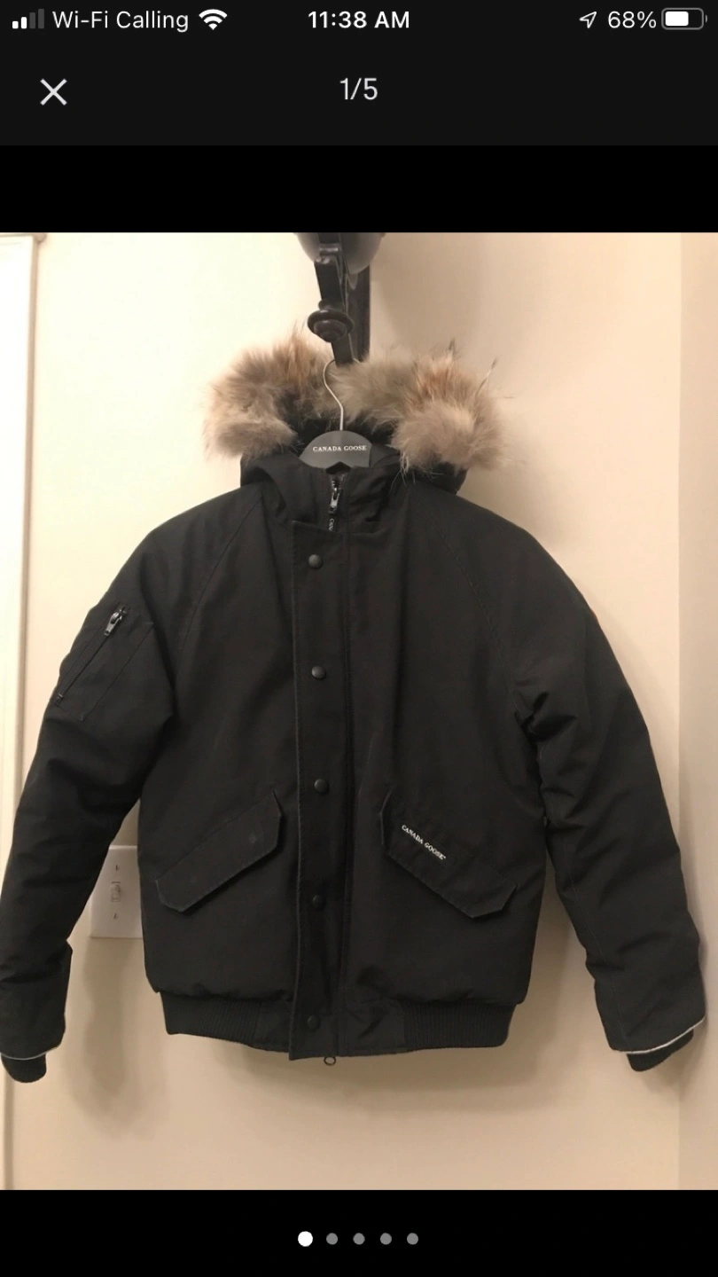 Selling a Canada Goose bomber jacket in size 14-16. It's black and has the Arctic Program patch. There is some slight wear in a few spots on the grey piping on the cuffs, as shown in the pictures. Overall very nice condition.