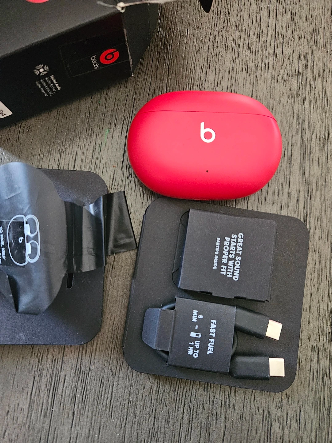 Selling a pair of Beats Studio Buds in red! They are in new condition and come with the original box and included components. Enjoy active noise cancelling and transparency mode for the best listening experience.(I will negotiate for lower offers)