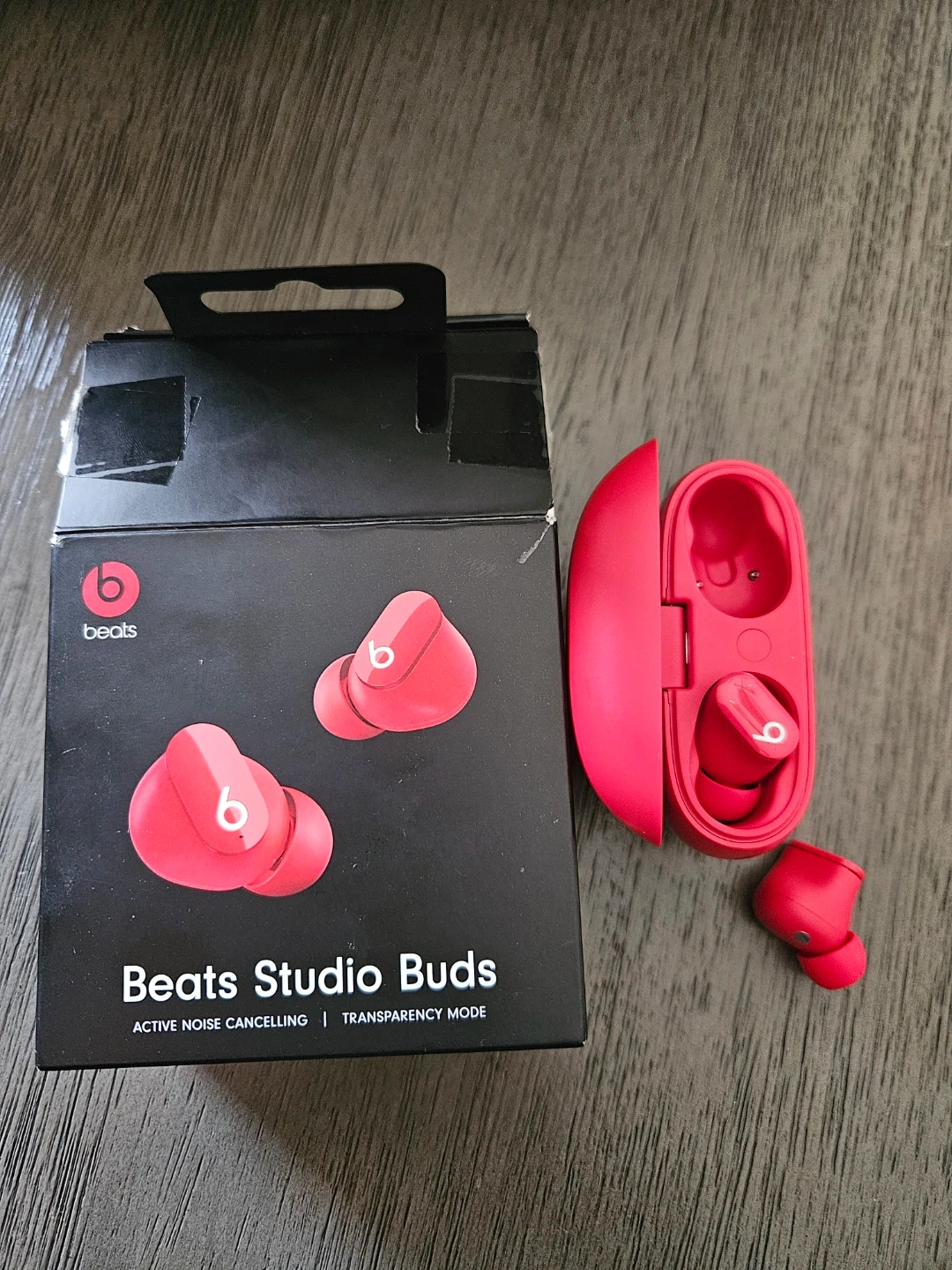 Selling a pair of Beats Studio Buds in red! They are in new condition and come with the original box and included components. Enjoy active noise cancelling and transparency mode for the best listening experience.(I will negotiate for lower offers)