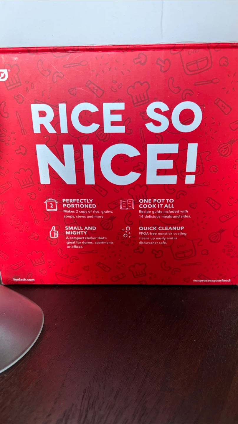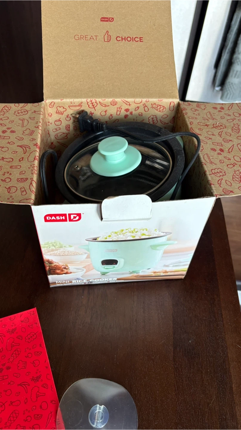 I'm selling a DASH mini rice cooker! It's great for making 2 cups of rice, grains, soups, stews, and more. It's small and mighty, making it perfect for dorms, apartments, or offices. It also has a PFOA-free nonstick coating for quick cleanup and is dishwasher safe. It even comes with a recipe guide that includes 14 delicious meals and sides