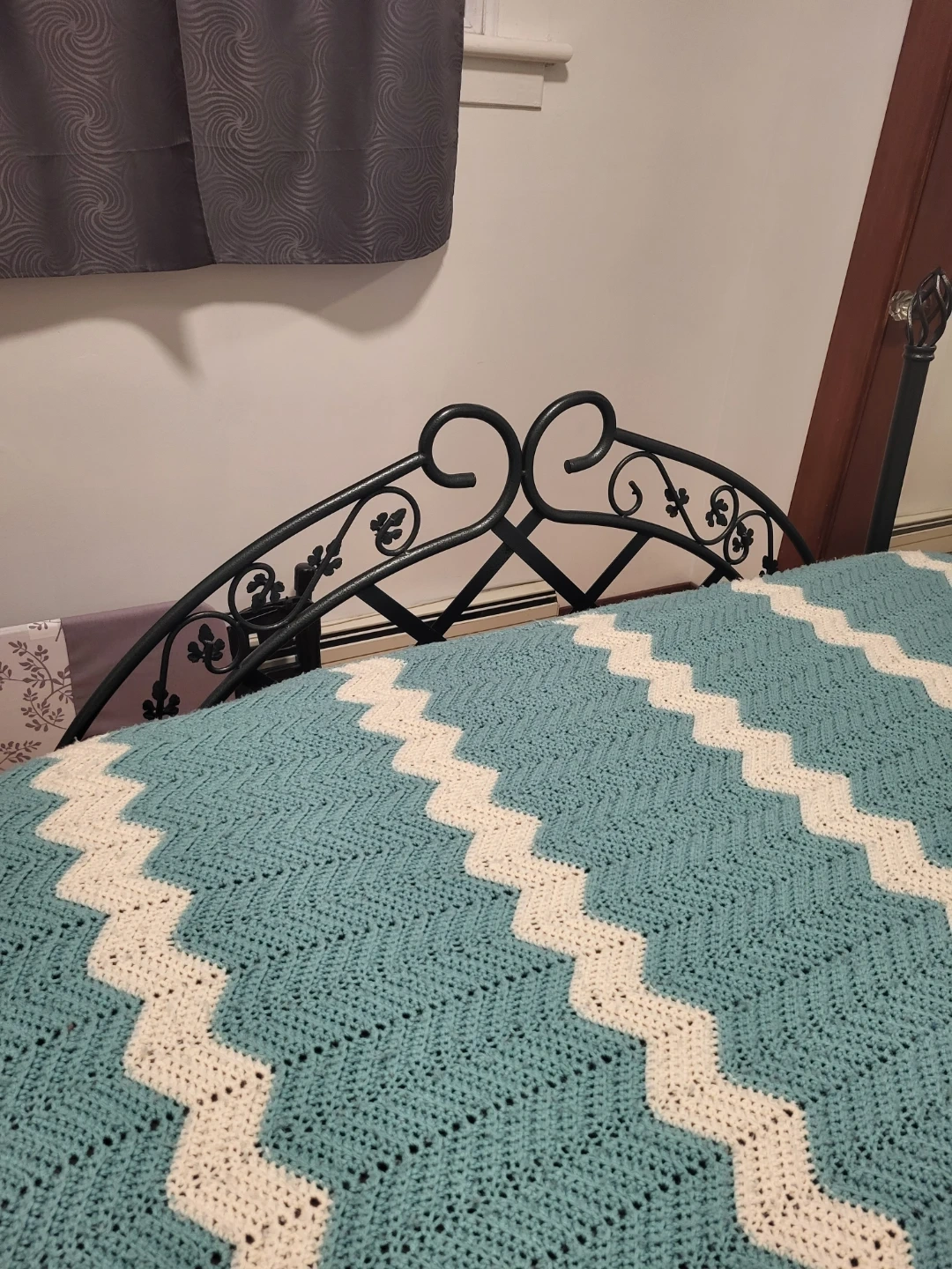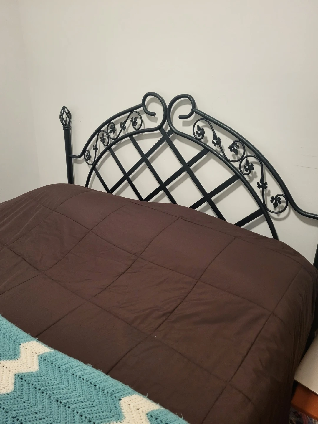 Selling a metal bed frame. It's in good condition and ready for a new home! The frame is green and features a decorative design on the headboard. Matress included