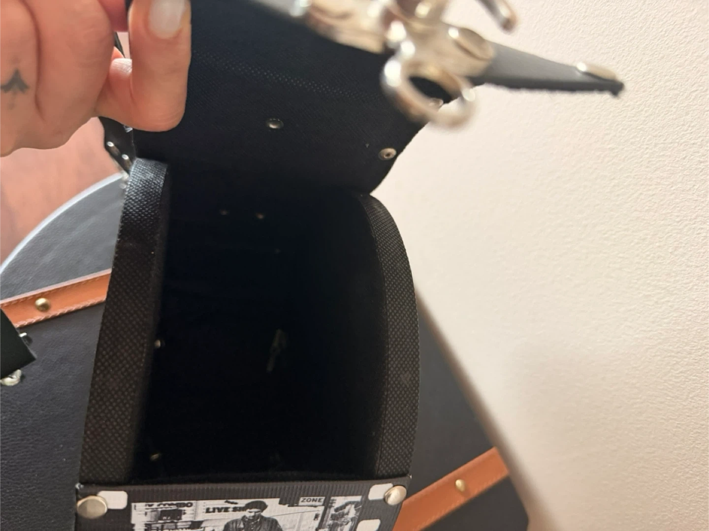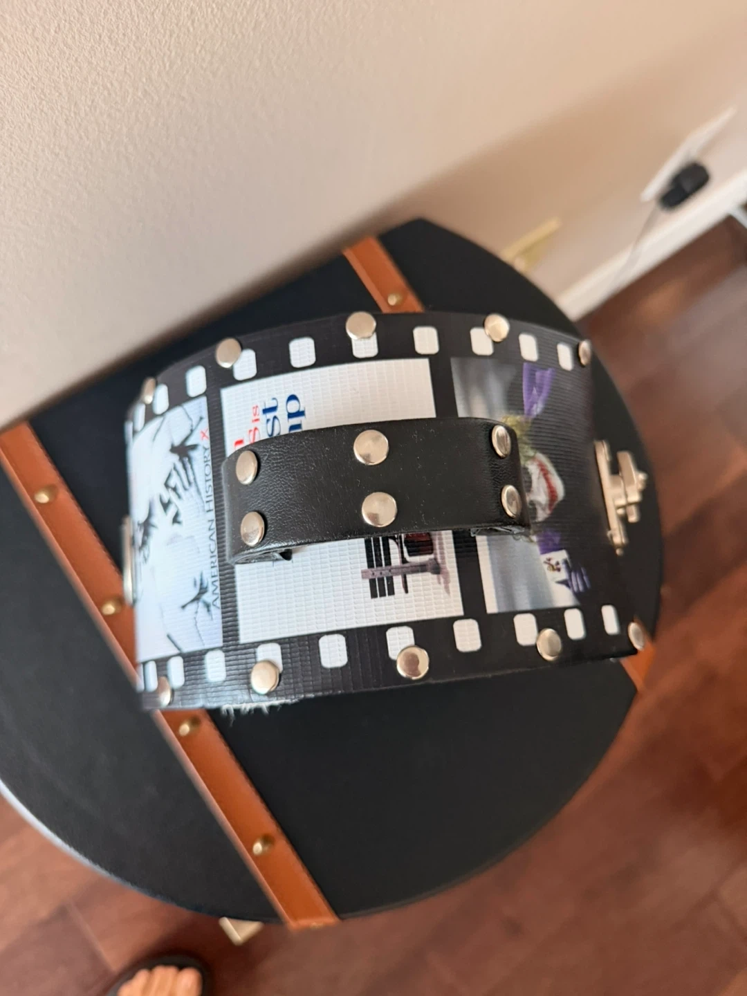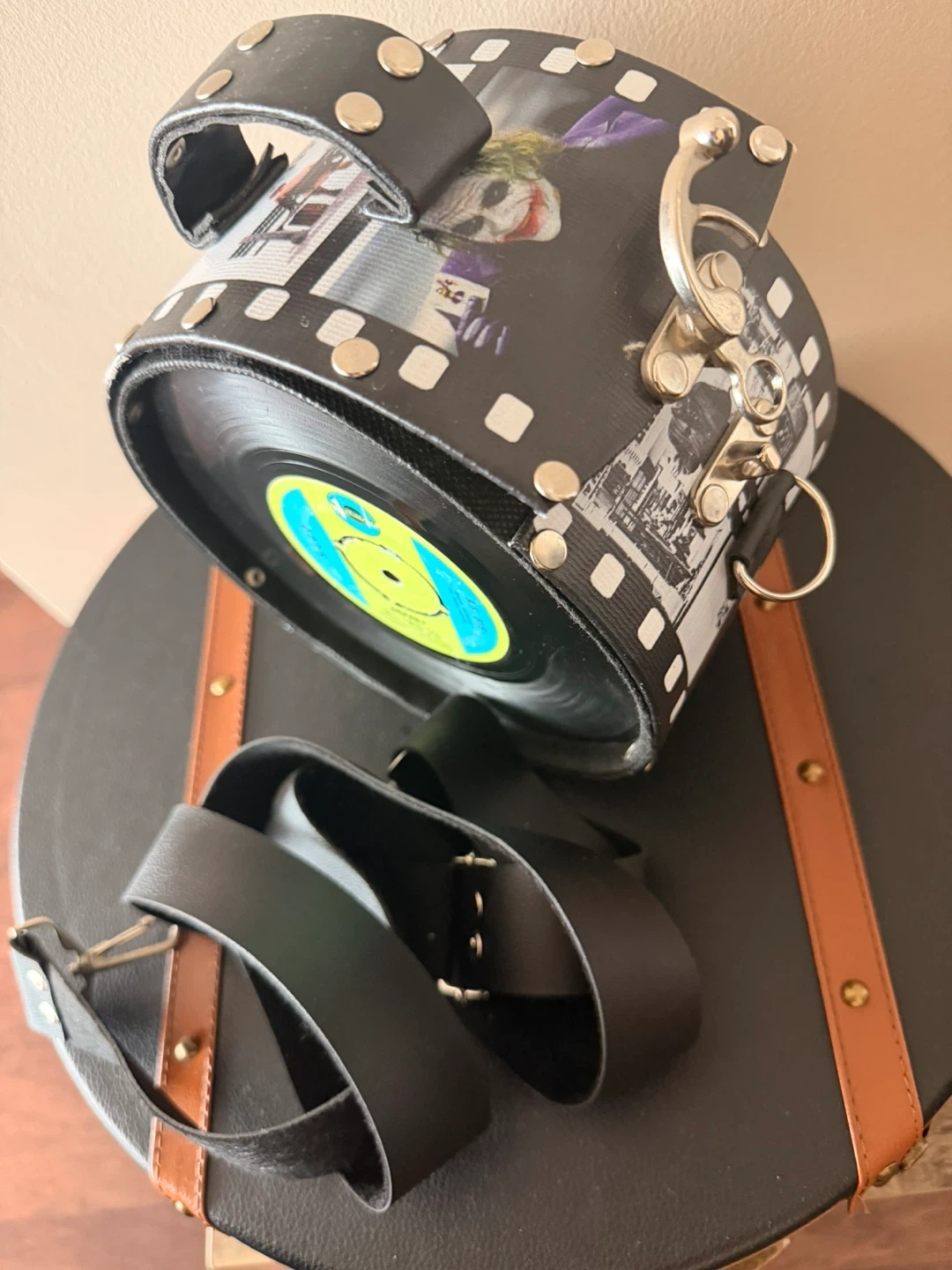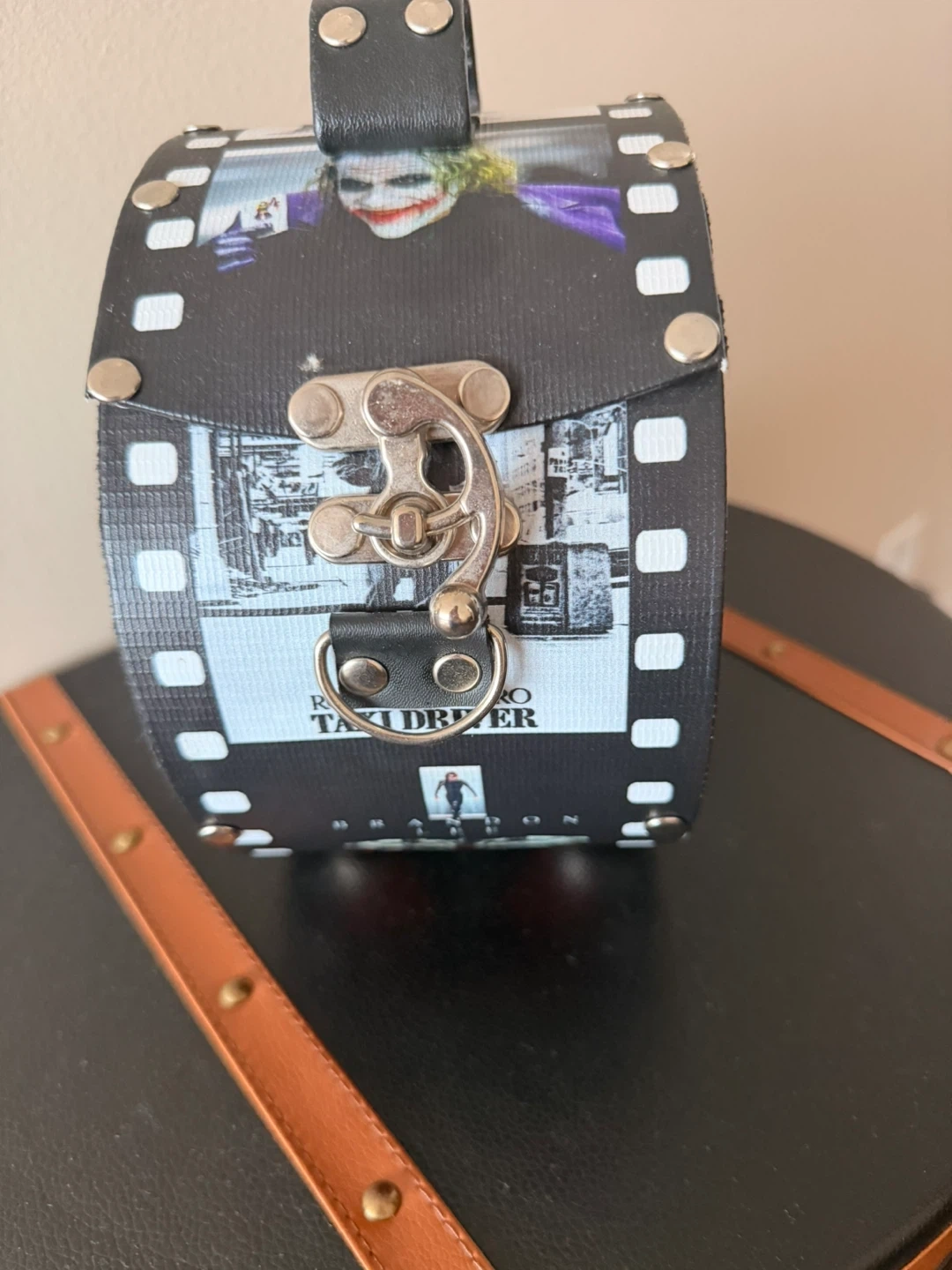 Check out this super unique purse! It's got a film strip design with images of The Joker and Taxi Driver, plus a vinyl record on the side. It's sure to be a conversation starter!