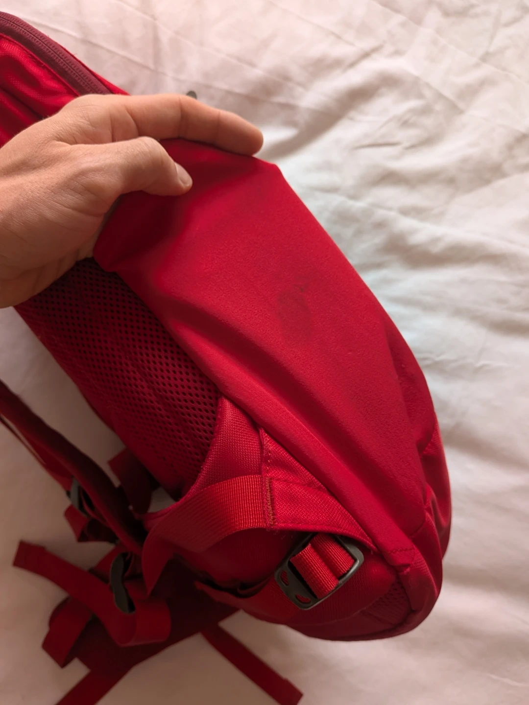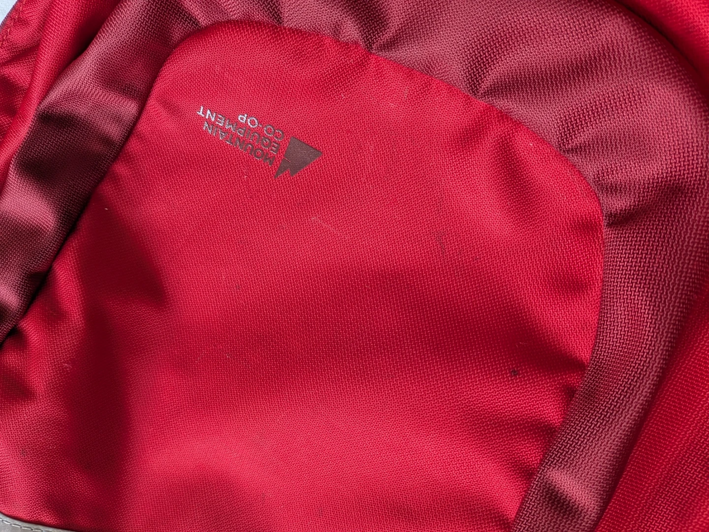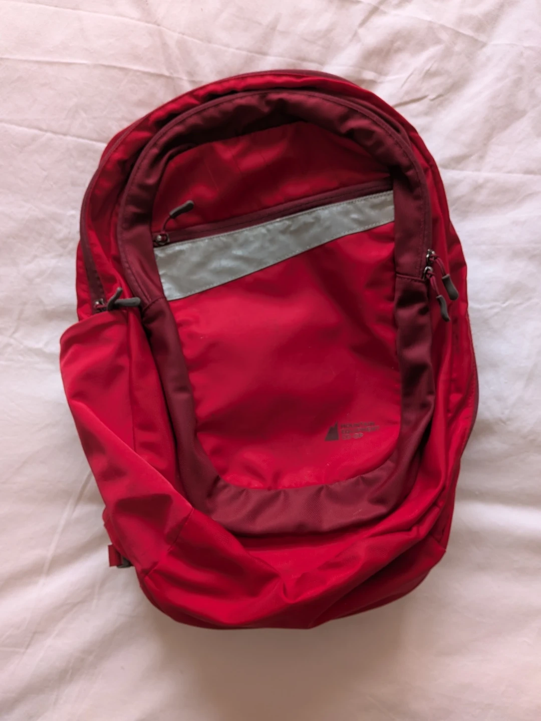 Selling a red Mountain Equipment Co-op (MEC) backpack. It's in good condition and ready for your next adventure or daily commute! It has a few minor marks (see close-ups).