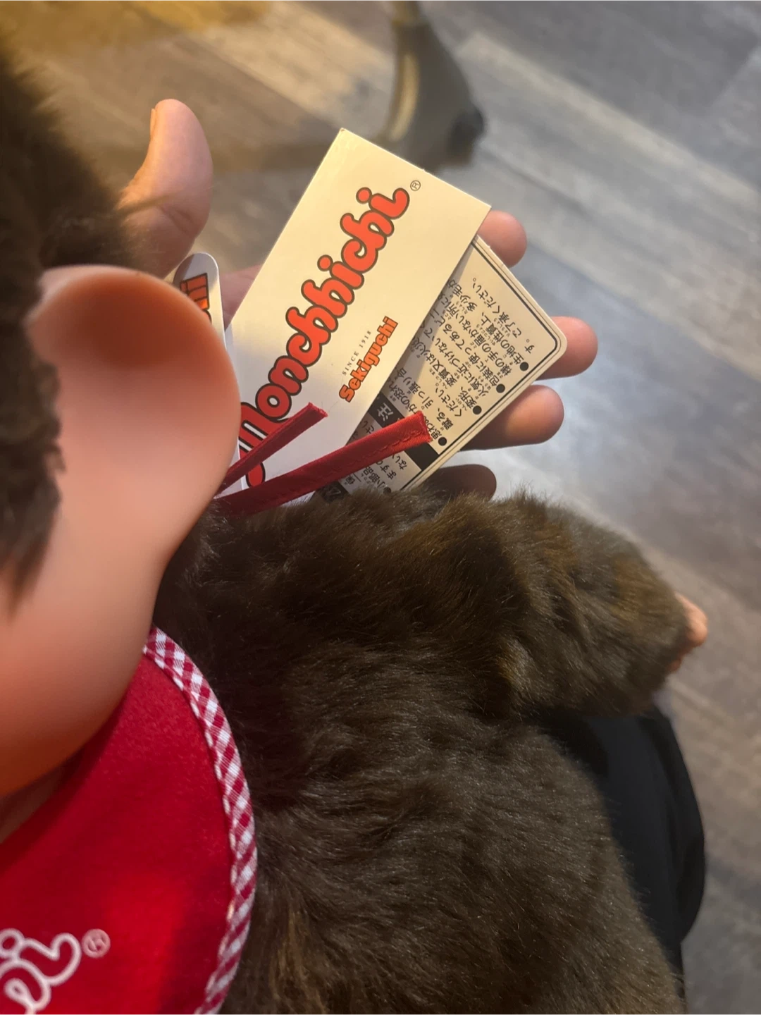 Selling a Monchhichi plush doll! It's in great condition and ready for a new home. The doll has a red bib with the Monchhichi logo.