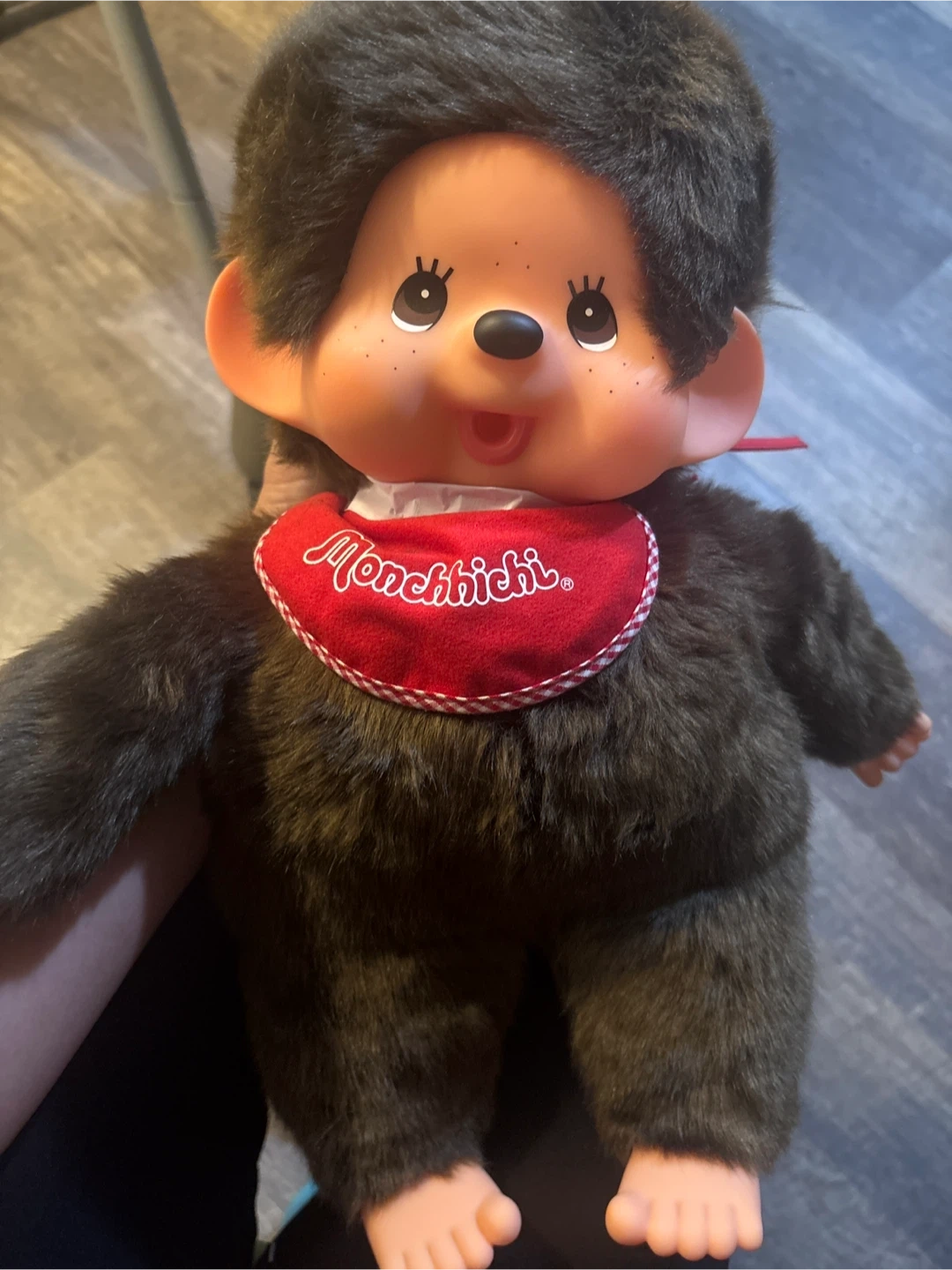 Selling a Monchhichi plush doll! It's in great condition and ready for a new home. The doll has a red bib with the Monchhichi logo.