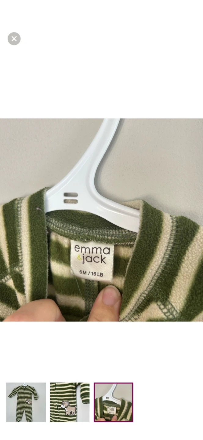 Emma & jack brand. Zip up fleece sleeper. Tan & green stripe with dog graphic. Size 6m. Brand new condition