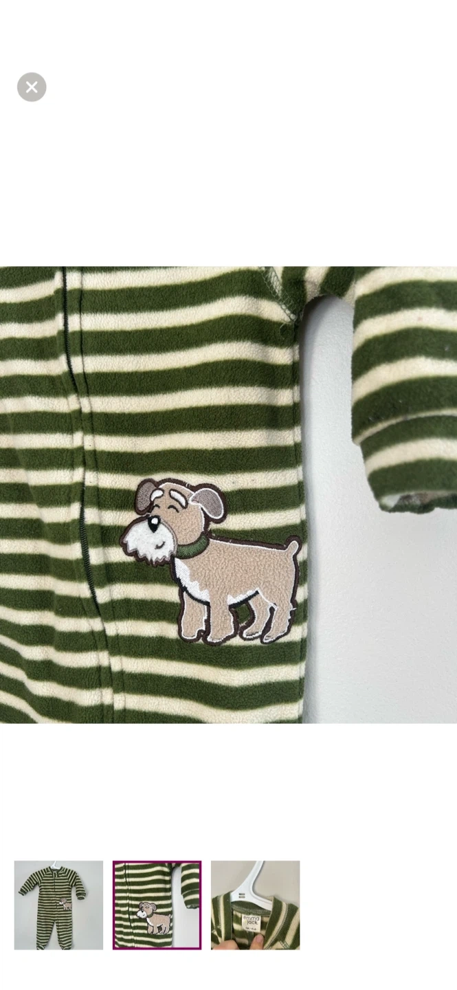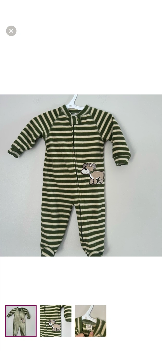 Emma & jack brand. Zip up fleece sleeper. Tan & green stripe with dog graphic. Size 6m. Brand new condition