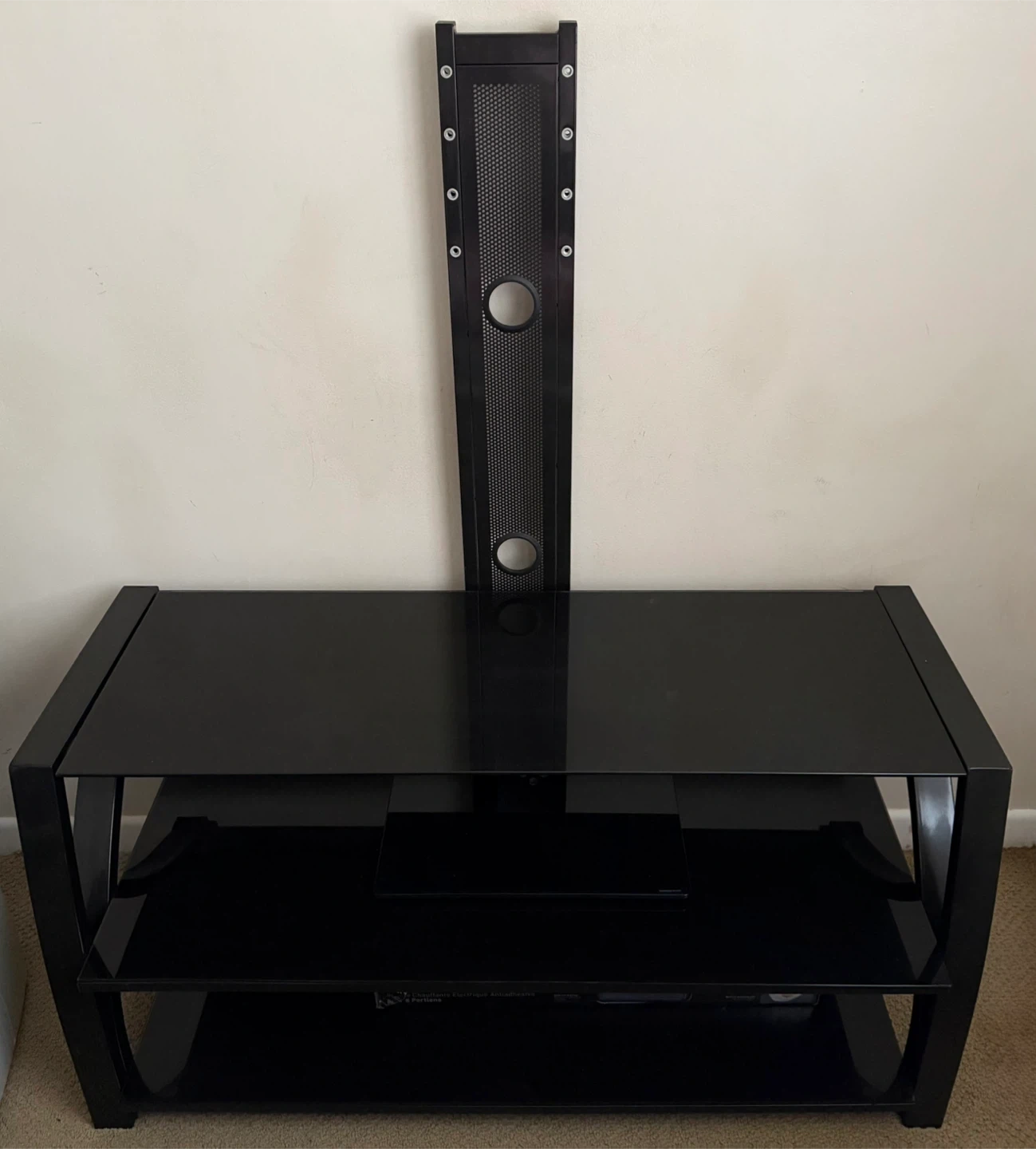 Selling a black glass TV stand. It's in great shape and would be perfect for your living room or entertainment area. It features multiple shelves for storing your media devices and accessories